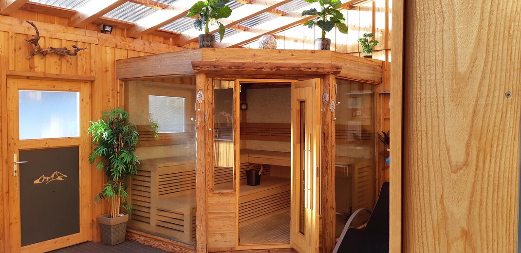 Im Aussenbereich (komplett überdacht und vom innenliegenden Wellnessraum zu erreichen) lädt