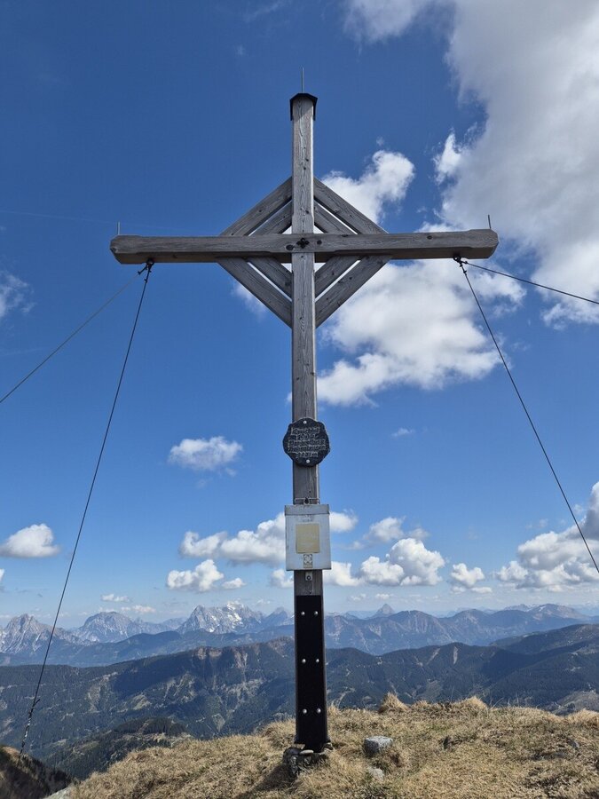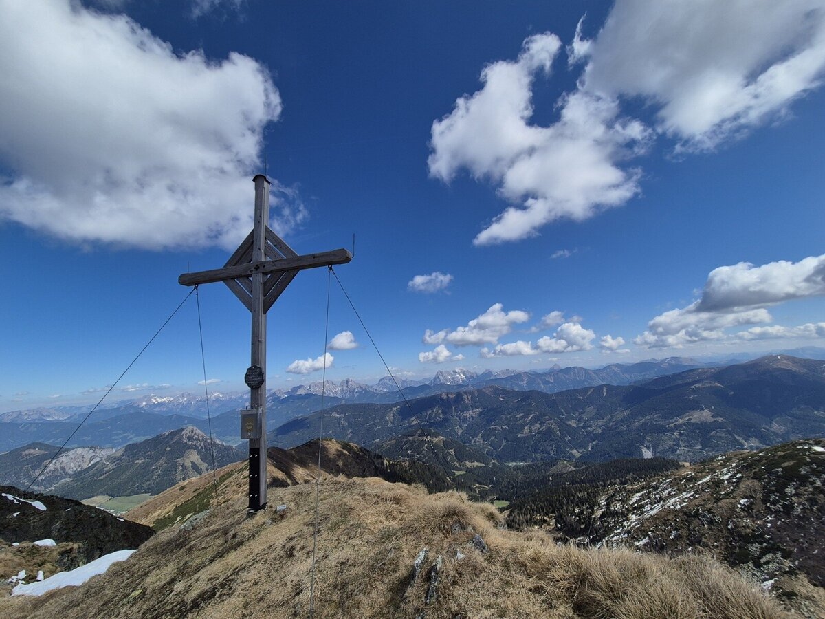 Ein kurzer Abstieg leitet den finalen Anstieg ein. Noch etwa 30 bis 40 Höhenmeter trennen uns vom Gipfel. Schließlich stehen wir am schönen Holzkreuz des Geierkogels auf 2.231 Metern Seehöhe.
