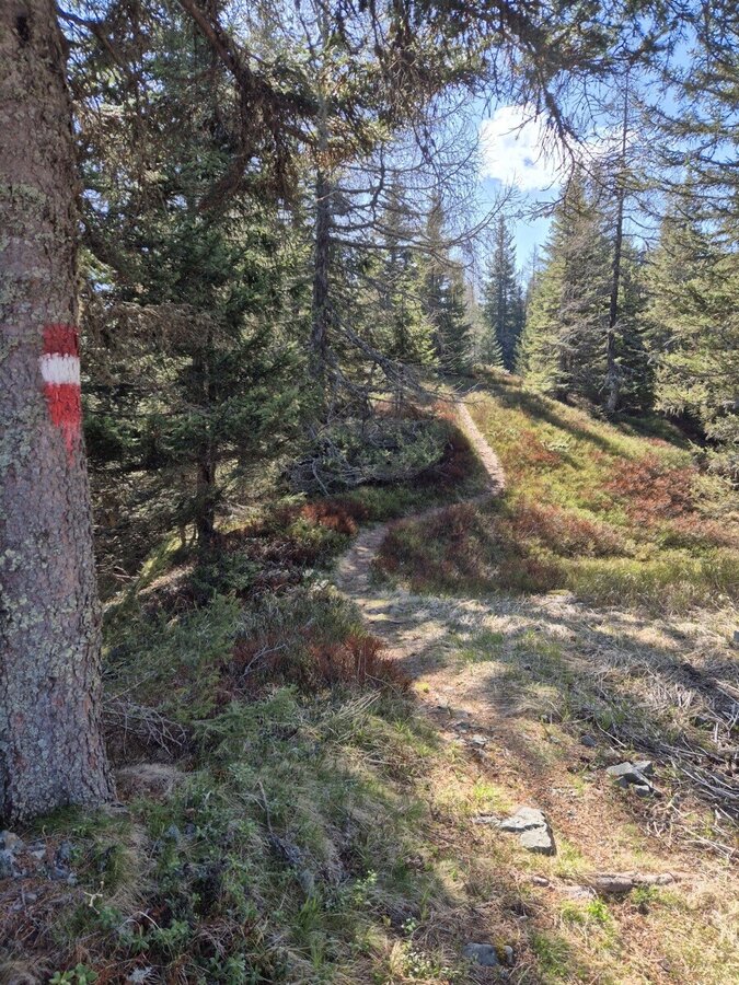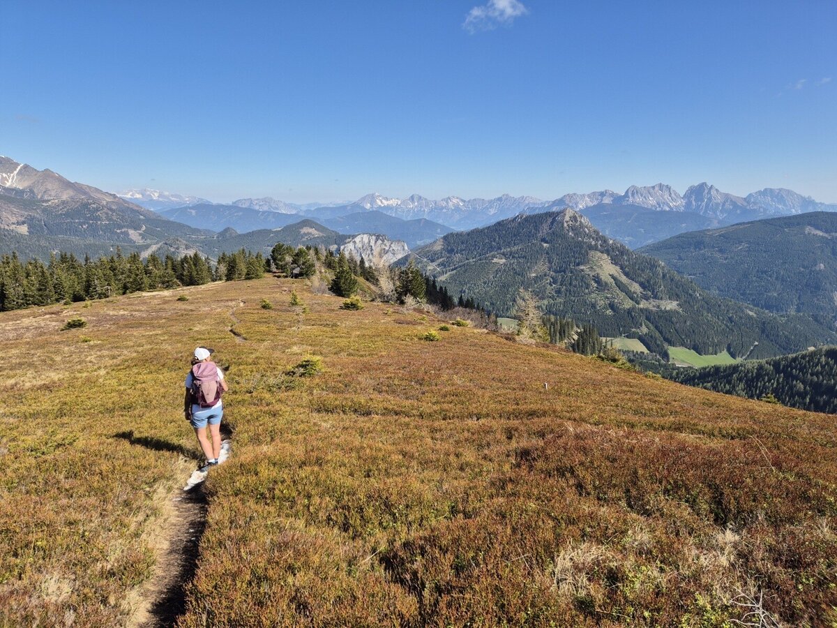 Weiter geht es südlich am Weg 902 – ein wahrlich traumhafter Abschnitt durch schattigen Wald und später über offene Almflächen. Immer wieder eröffnet sich ein atemberaubender Blick in die umliegende Bergwelt. Über den Kainzenboden wird der Weg etwas steiler, und wir erreichen eine erste Geländekuppe. Vor uns liegt das nächste Zwischenziel: eine namenlose Erhebung, die wir wenig später erklimmen.