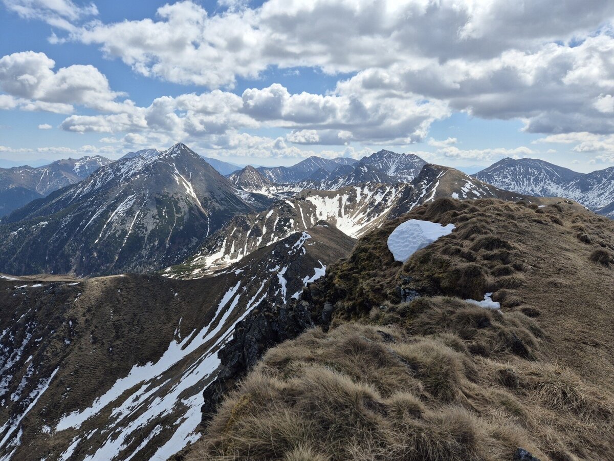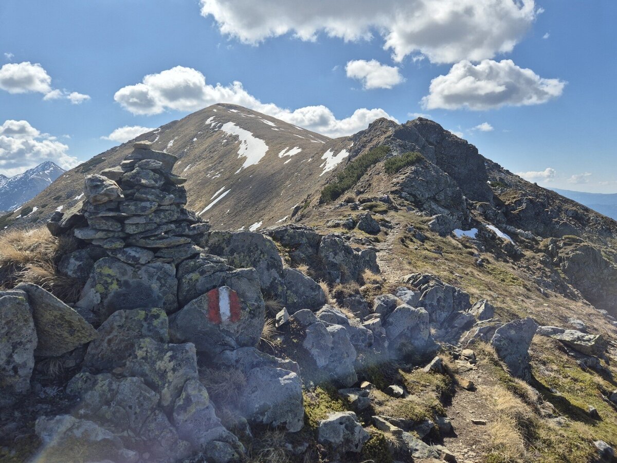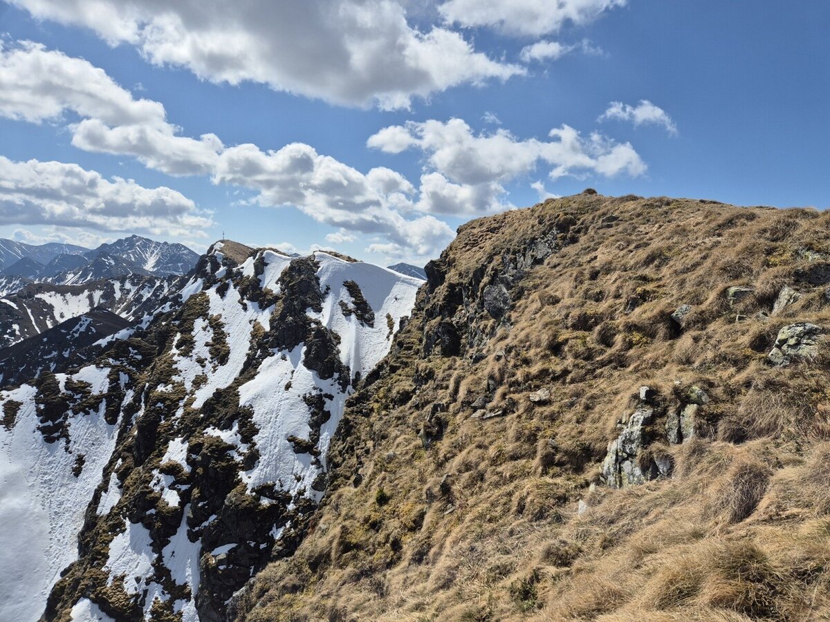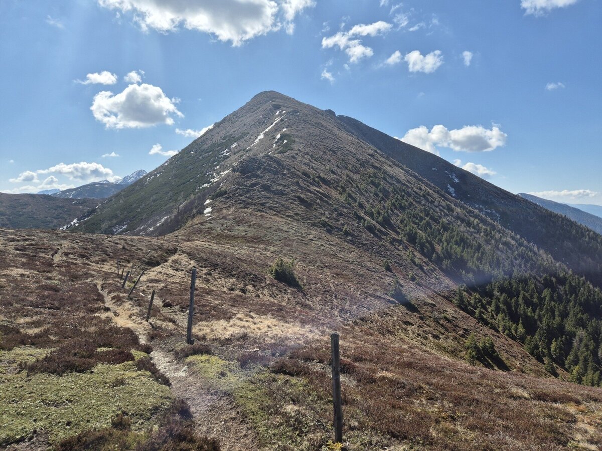 Der Pfad schlängelt sich nun entlang leicht abschüssigem Gelände – mit etwas Umsicht jedoch vollkommen problemlos. Einfach den Markierungen folgen. Es geht stetig, aber nicht steil, weiter hinauf zu einer Art Vorgipfel des Geierkogels. Von dort erblicken wir erstmals unser Ziel – ein beeindruckendes Panorama gerade im Frühling: Die Hänge sind teilweise noch schneebedeckt, während die Sonne die Vegetation in warme Brauntöne, Gold und Gelb taucht. Im Hintergrund erhebt sich der markante Gamskögel – ein echtes Postkartenmotiv.
