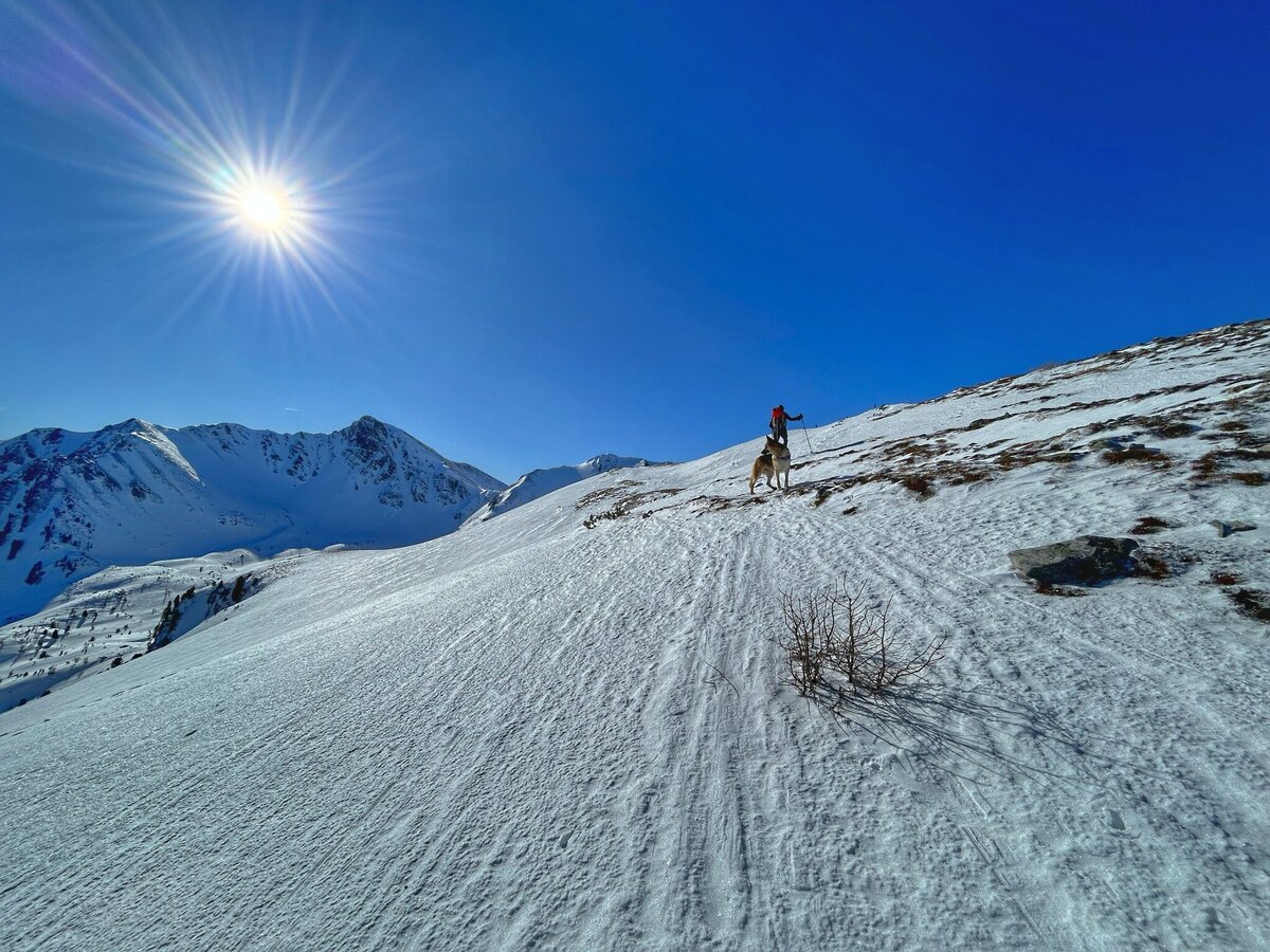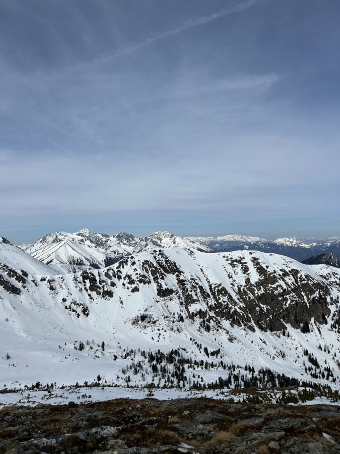 Sobald Straßenböschung gut zu bewätigen ist, verlassen wir die Forststraße auf die linke Seite in Richtung Triebenfeldkogel. Nun ist die Route durch lichten Wald, im kupierten Gelände zu suchen. Es gibt viele Möglichkeiten. Die letzten 200 Höhenmeter zum Gipfel sind etwas steiler, im kupierten Gelände erspart man sich bei guter Spuranlage die Spitzkehren. Leicht links haltend, erreicht man in einem großen Rechtsbogen über den NW Rücken den Gipfel des Triebenkogels.