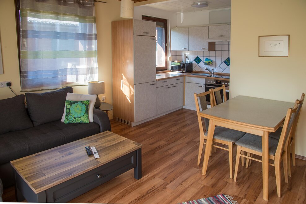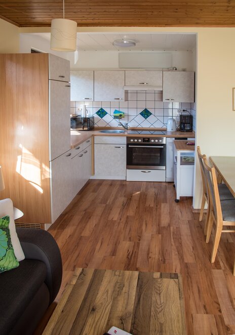 Die Ferienwohnung bietet großzügigen Komfort mit zwei Schlafzimmern – eines davon als klassisches Doppelzimmer, das andere als praktisches Zweibettzimmer. Im gemütlichen Wohn- und Essbereich steht zusätzlich ein ausziehbares Schlafsofa zur Verfügung. Die Küche ist komplett ausgestattet und lässt keine Wünsche offen: Cerankochfeld, Backofen, Geschirrspüler, Mikrowelle, Kühlschrank mit Eisfach, Wasserkocher, Kaffeemaschine sowie ein vollständiges Geschirr- und Besteckset samt aller Kochutensilien sind vorhanden.