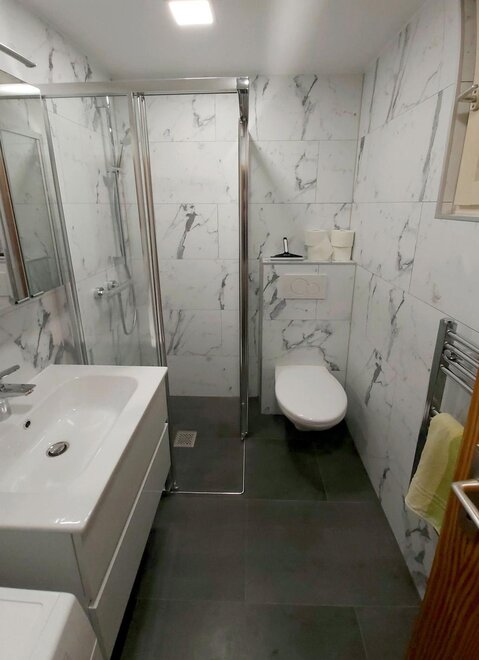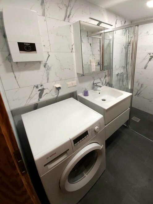 Das moderne Badezimmer ist barrierefrei gestaltet und verfügt über Dusche, Waschbecken, WC, eine Waschmaschine und einen beheizten Handtuchhalter. Ein Fernseher mit kostenlosem WLAN-Anschluss sorgt für Unterhaltung. Frische Handtücher und Bettwäsche werden selbstverständlich bereitgestellt. Die Beheizung erfolgt in allen Räumen komfortabel über thermostatisch gesteuerte Infrarotstrahler.