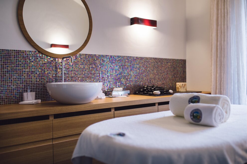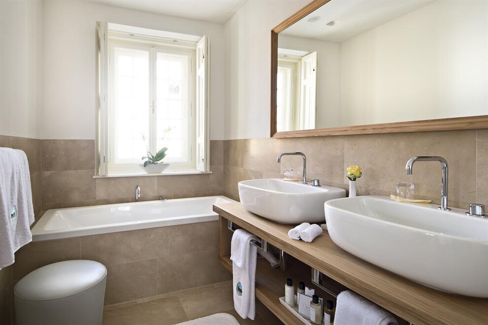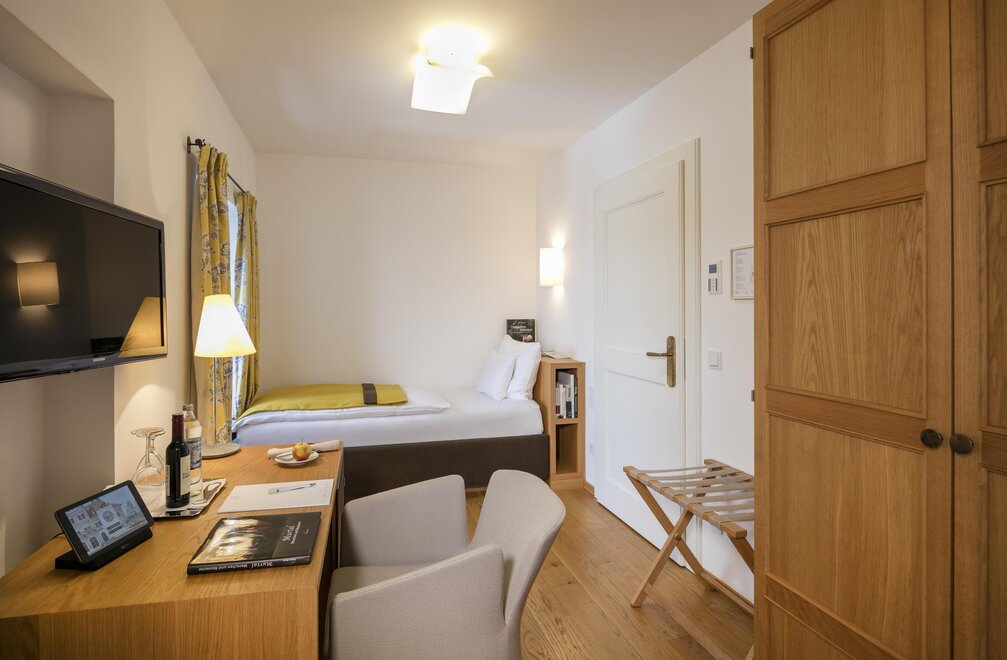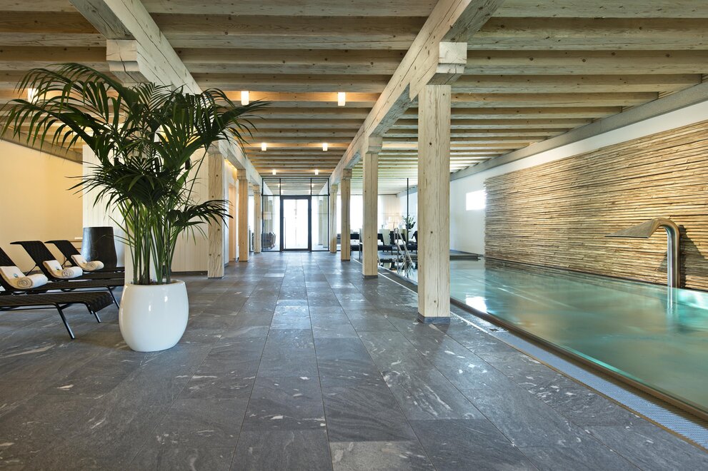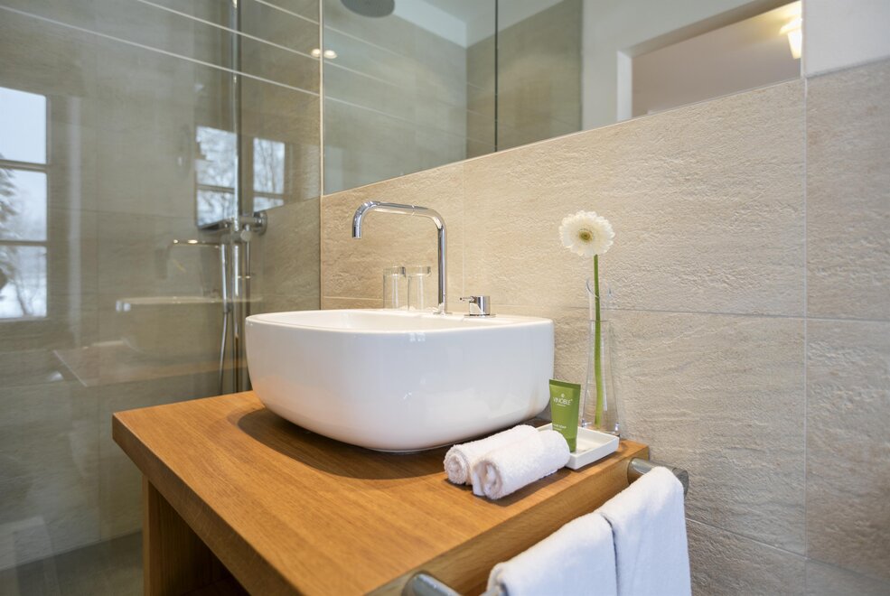 Im Badezimmer, fast jedes mit Badewanne und Dusche ausgestattet, findet Ihr unter anderen Annehmlichkeiten auch kuschelige Bademäntel. Schlüpft hinein und besucht den großzügigen SPA Bereich, den Ihr immer innerhalb des Gebäudes erreichen könnt. Gleich, ob Ihr im Haupthaus oder im liebevoll renovierten ehemaligen Stallgebäude mit seinen hellen und modernen Maisonette-Suiten wohnen.