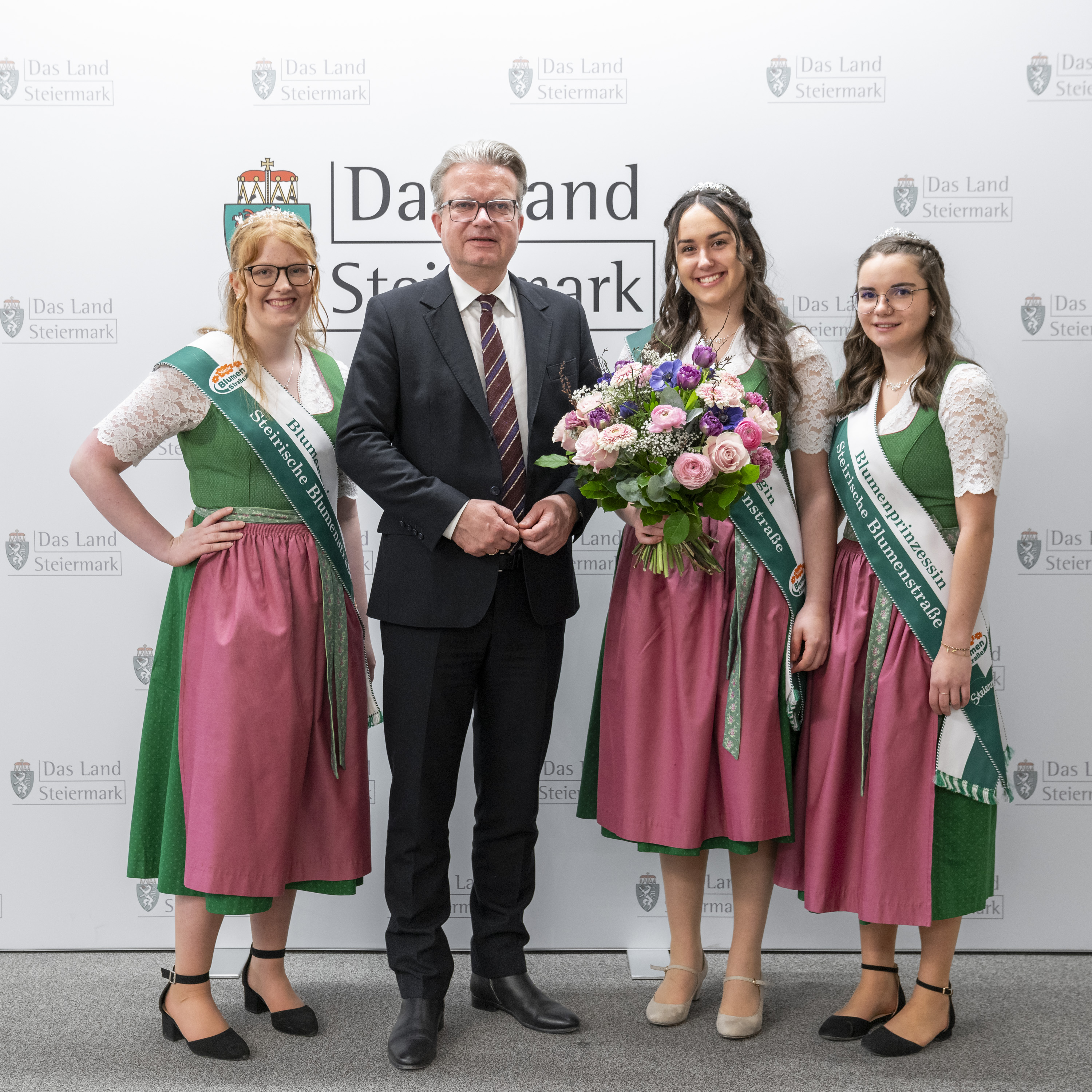 v.l.: Blumenprinzessin Anna-Sophie, Landeshauptmann der Steiermark Christopher Drexler, Blumenkönigin Elisa I. und Blumenprinzessin Laura.