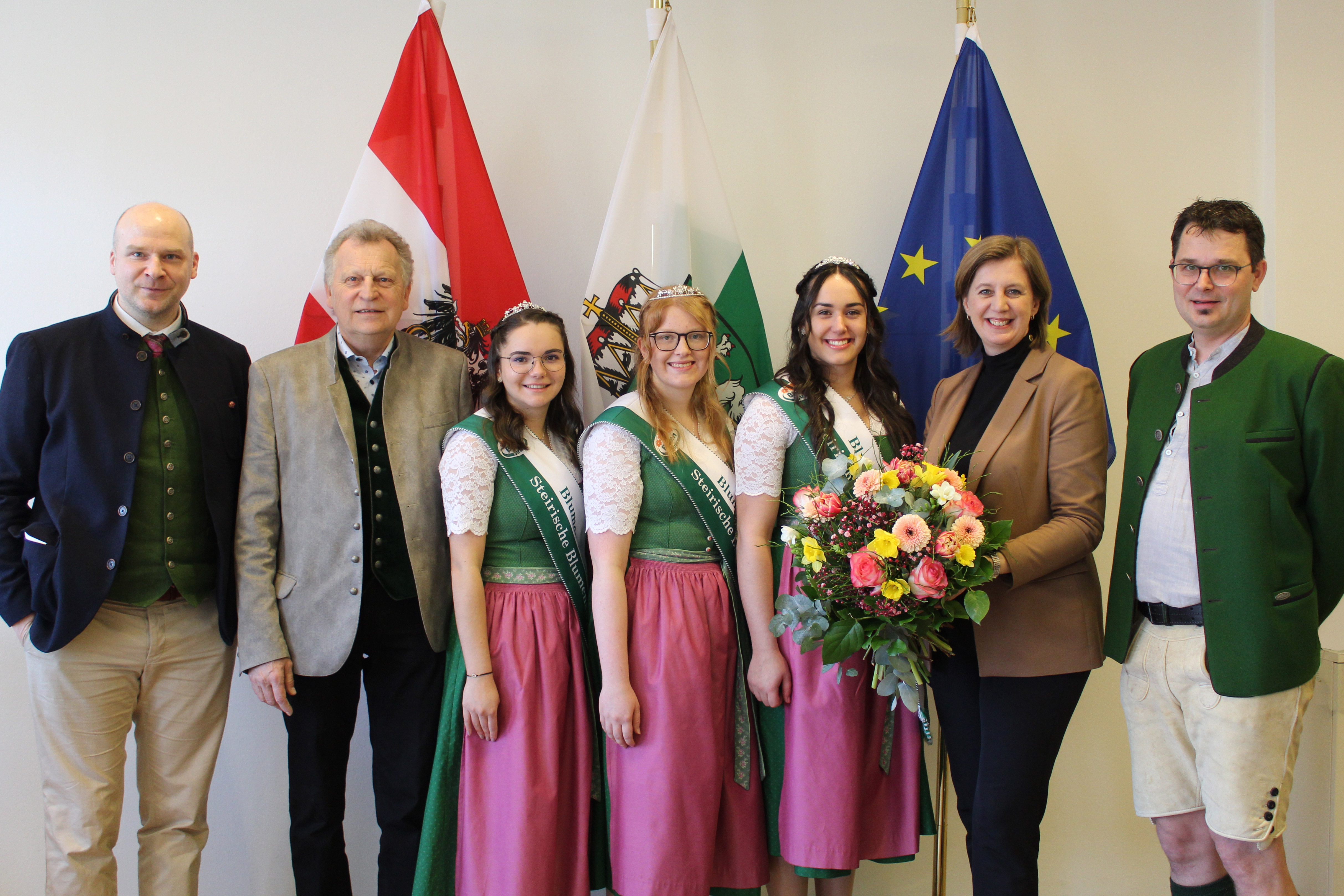 Bundespräsident Alexander Van der Bellen empfing mit großer Herzlichkeit die für zwei Jahre neu gewählten Blumenhoheiten in der Wiener Hofburg. Landeshauptmann Christopher Drexler lud in die Grazer Burg, Landesrätin Barbara Eibinger-Miedl in ihr Büro am Grazer Nikolaiplatz. Im Fokus des Austausches standen die neuesten Entwicklungen rund um die Steirische Blumenstraße und ihre touristische Bedeutung als von Wien und Graz sehr nahe Destination.