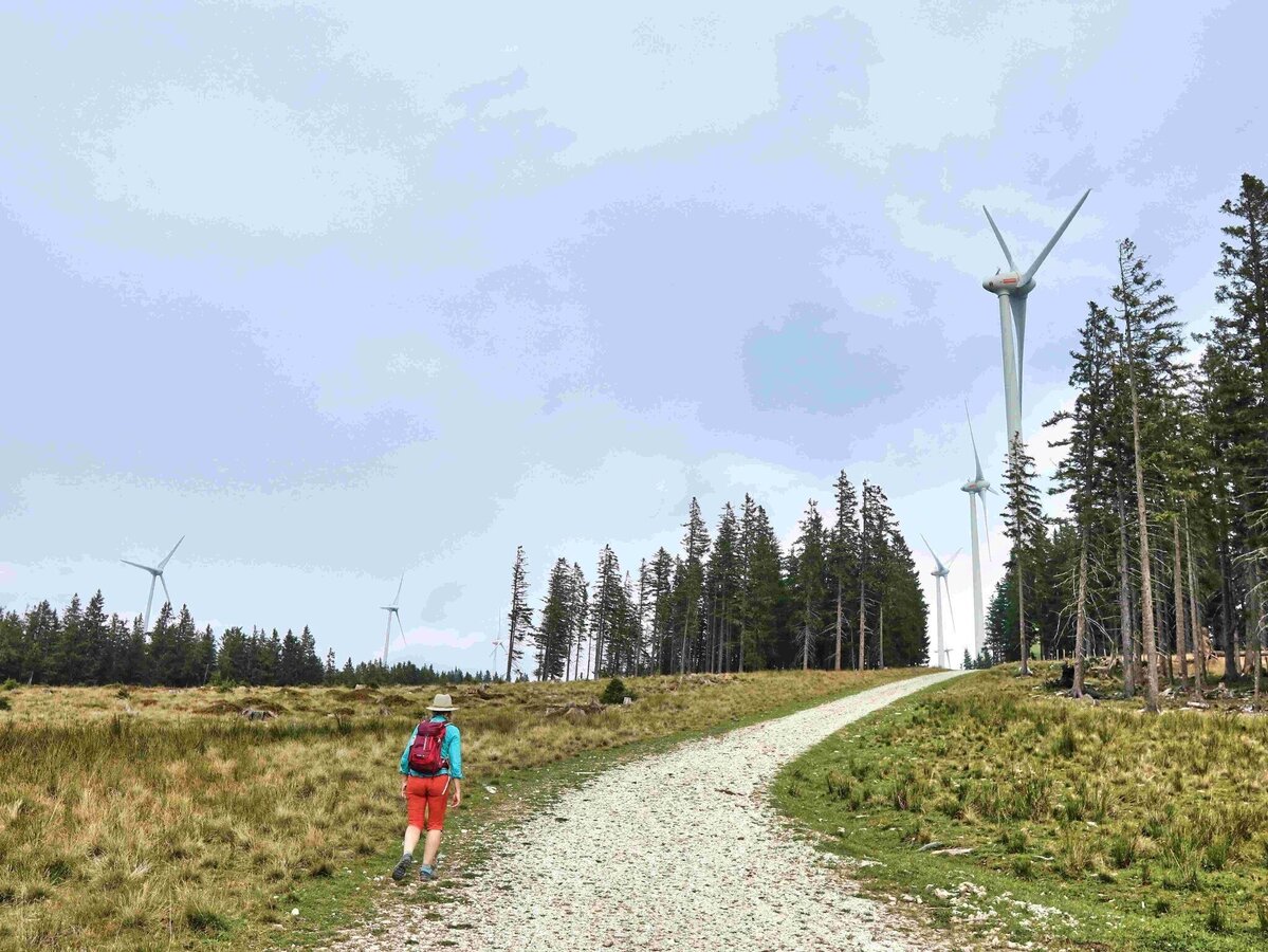 Day 3: From Schanzsattel, the trail leads unmistakably past the large Peace Cross along the left edge of a small ski slope, first through high forest and then across extensive alpine meadows, always slightly uphill in a north-easterly direction to the striking Teufelstein (1. 499m). 499m, a place of power, considered to be the oldest cult site in Styria), then almost directly south again and a short, somewhat steeper descent to the Halterhütte (open at weekends in summer) at the Alptor (1,386m, no overnight accommodation, but a recommended snack). From here, follow a forest path for a short stretch together with the tour around Joglland to the east, but soon the path turns north and descends to the Lendkreuz (1,044 m), where there are two options: either turn left uphill to Peter Rosegger's birthplace (1. 144m, recommended, but takes about an extra hour of walking) or a short stretch flat out of the valley following the asphalt road to the Grabler farmstead and then turning right via a path to Gasthof Schlagobersbauer (culinary tip: nomen est omen). If you choose the variant via the birthplace, you can descend from there via the marked hiking trail to the forest school and from here a signposted path also leads to the Gasthof Schlagobersbauer.by means of a striking east - north - east loop, the country road, which leads over the Alpl, becomes visible and in a few minutes you reach the Roseggerhof (1,096m, highly recommended inn, overnight stay possible) walking along it. The trail climbs again - but never really extremely steep and always through cool forest to the Jägerhöhe (1,227m) and further on, now almost flat, to the Red Cross, a striking wayside cross, after which you soon reach the Hauereck (1,301m) with the Sonnenhütte (overnight stay possible), just a short distance away and then one of the most beautiful panoramic hiking trails in the Eastern Alps begins, which is even part of the EU alpannonia® project. From Hauereck uphill through typical alpine high forests and suddenly you reach the wind farm on the Rattener Alm (open in summer) and the Steinriegel (1,577m). In the shadow of the mighty wind turbines over alpine pastures and through a short section of forest to the Rosegger Schutzhaus (1,586m), which is already visible just below the Pretul summit. Overnight stay and obligation to eat blackberry strudel (as blueberries are called in Styria)! 3 hours Schanzsattel - Roseggerhof, 3 ½ hours Roseggerhof - Hauereck - Pretul/Rosegger Schutzhaus