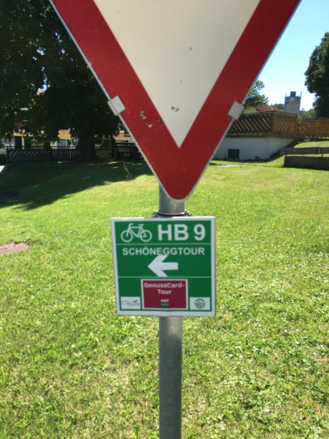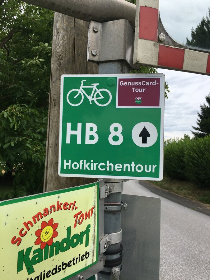 Markierung: Die gesamte Tour ist mit violetten "GenussCard-Tour" Stickern markiert und führt entlang folgender Radwege: