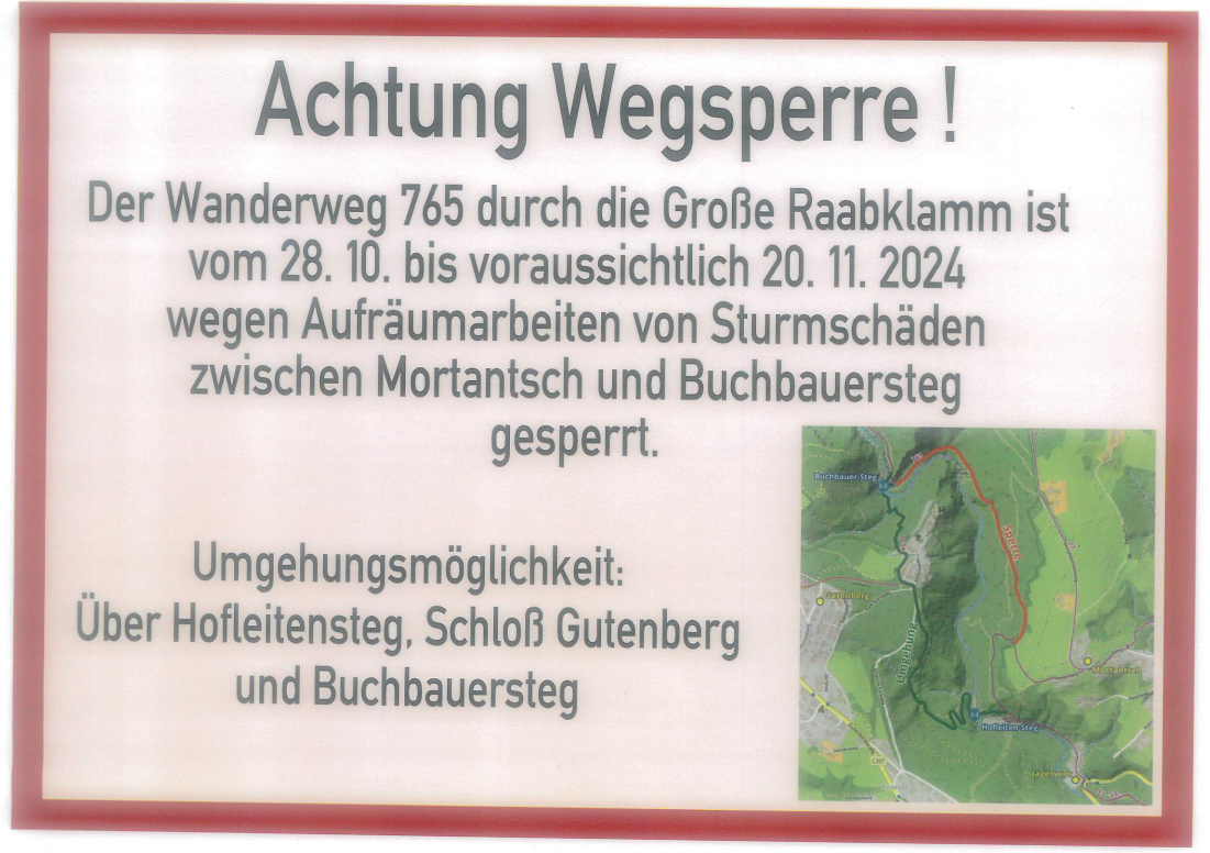 Die Große Raabklamm mit einer Länge von rund 10 Kilometern wurde 1970 zum Naturschutzgebiet erklärt und ist mittlerweile Teil des NATURA 2000-Netzwerkes der EU. Während der südliche Teil der Klamm durch seine düstere, märchenhafte Atmosphäre besticht, zeugen die bizzaren Felsformationen des nördlichen Kalk-Teils von der stetigen Arbeit der Naturkräfte und verleihen der Klamm einen wildromantischen Charakter. Entlang schroffer Felswände, wunderschöner Grauerlen-Auen und begleitet vom rauschenden Wasser der Raab können Sie dieses ursprüngliche Naturparadies auf bestens gesicherten und markierten Wegen und Stegen erwandern und genießen. Alle Abzweigungen und Wege sind sehr gut beschildert und bei allen Einstiegsstellen gibt es Parkmöglichkeiten für PKW und Busse.