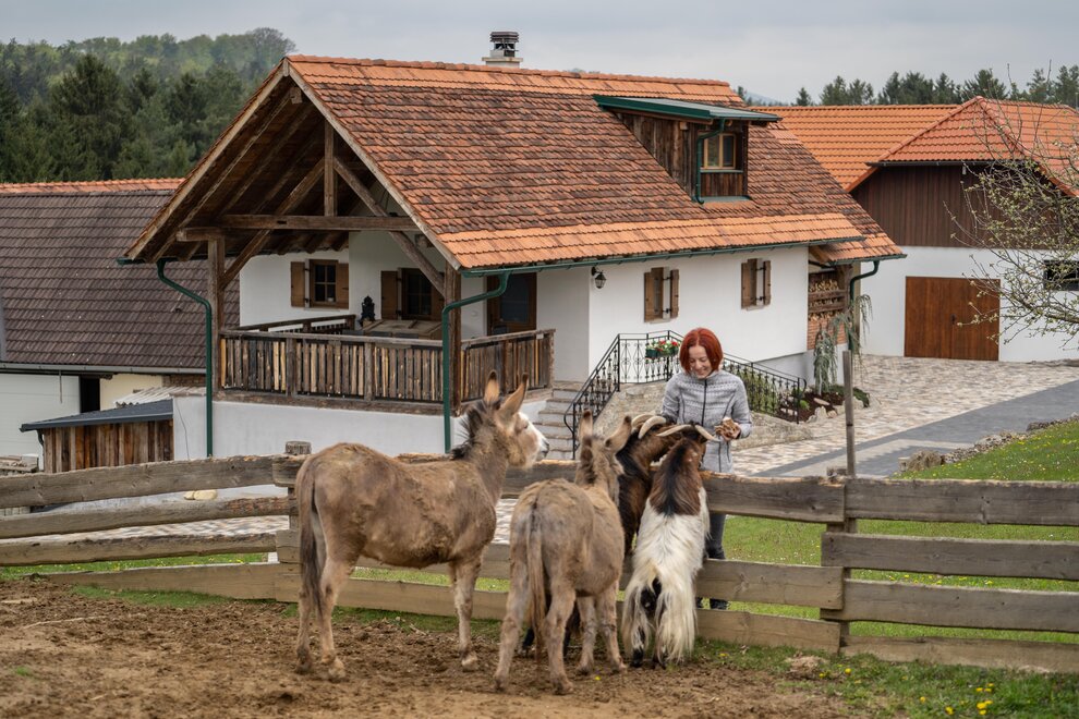 Auf der großzügigen Terrasse kann man ausgiebig die Ruhe genießen, den Blick schweifen lassen und unsere Esel und Ziegen beobachten.