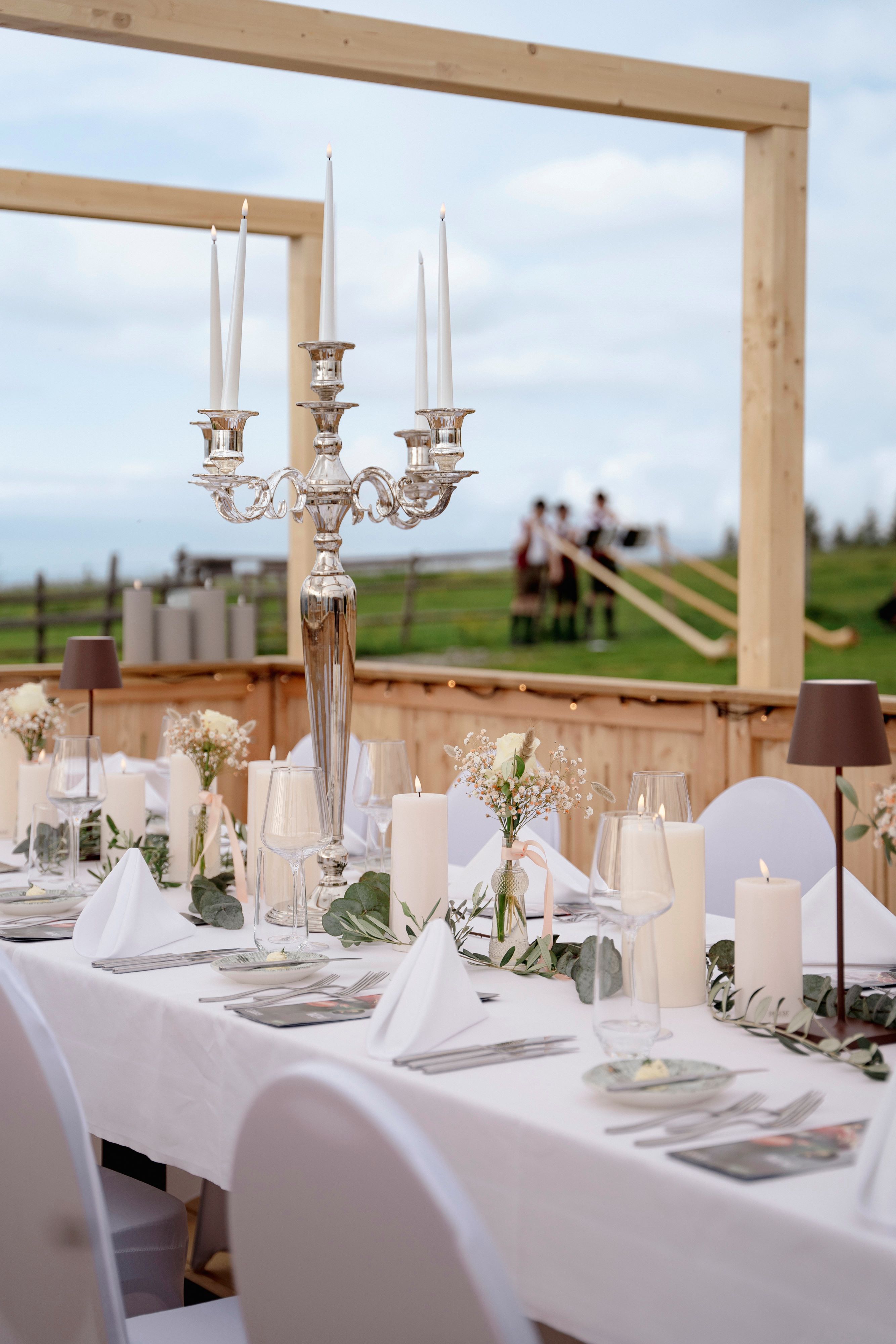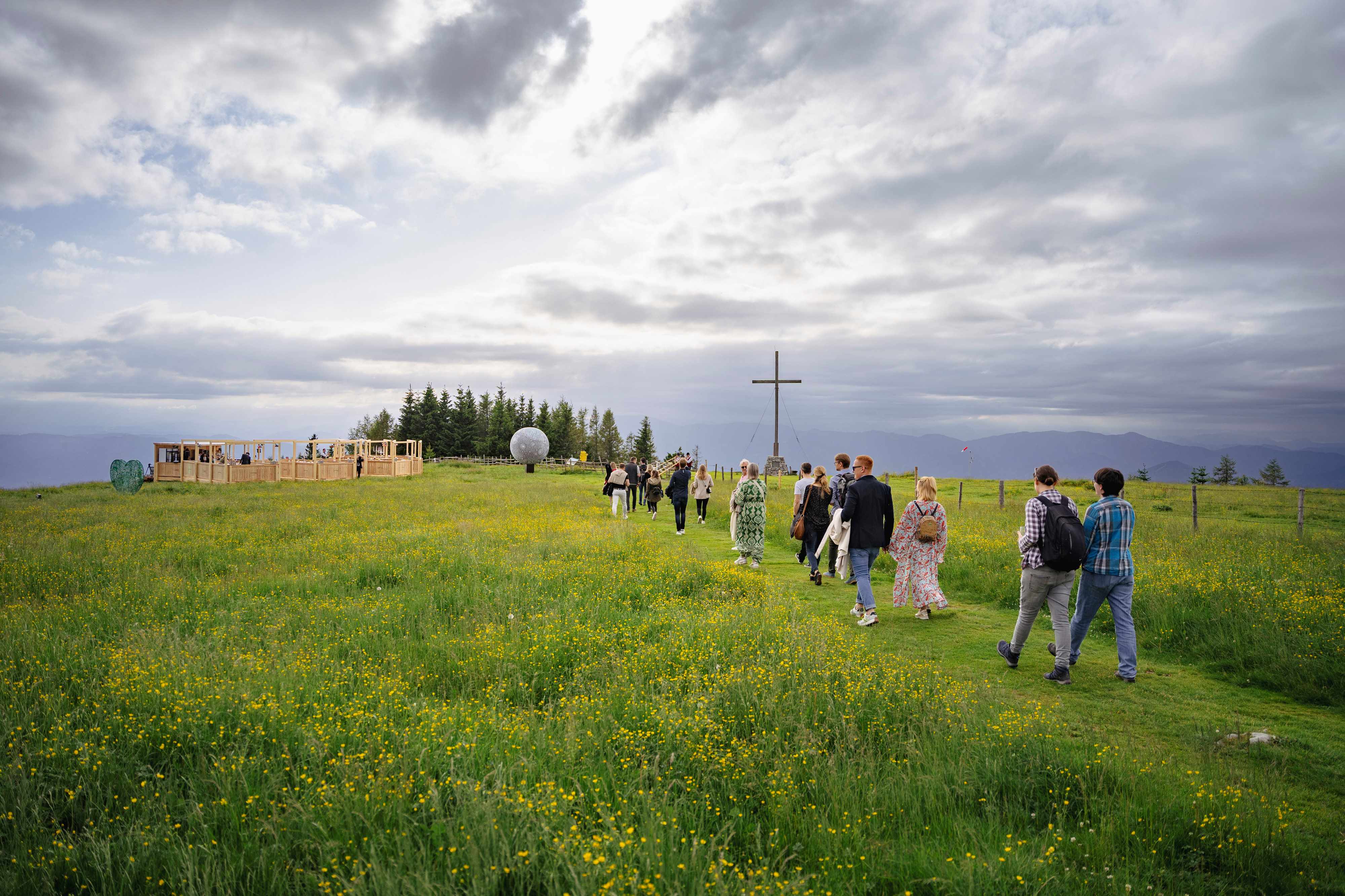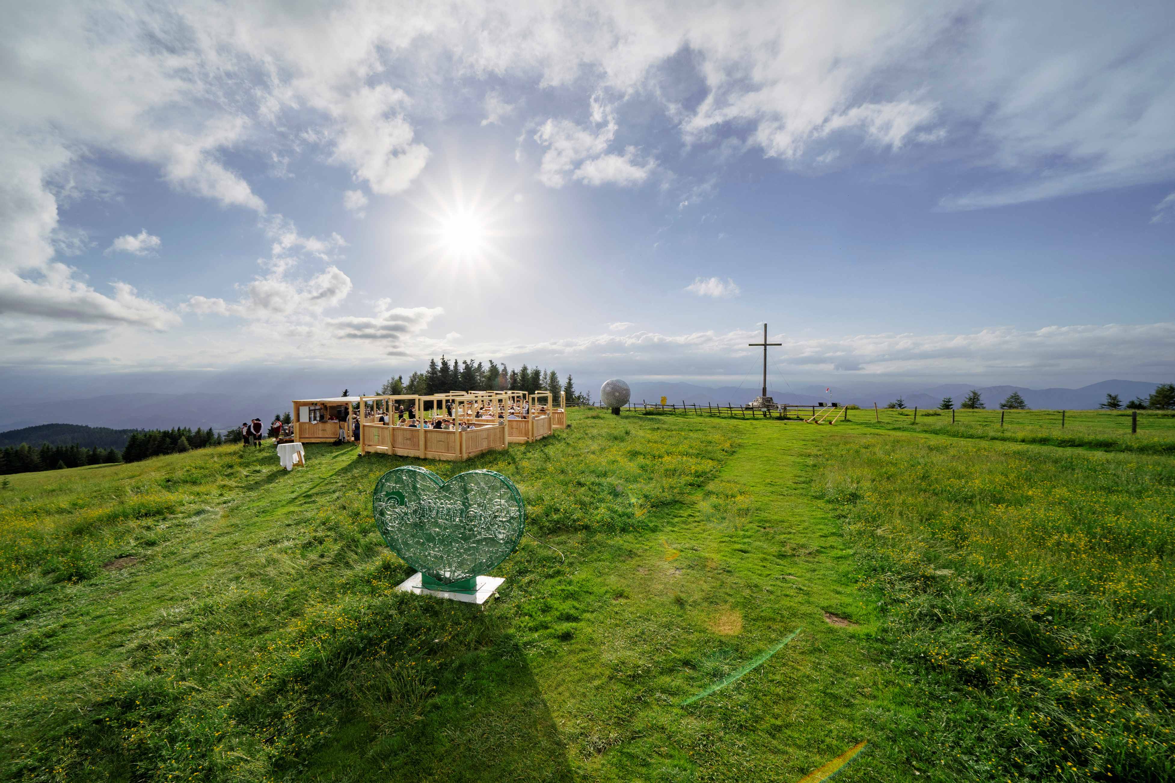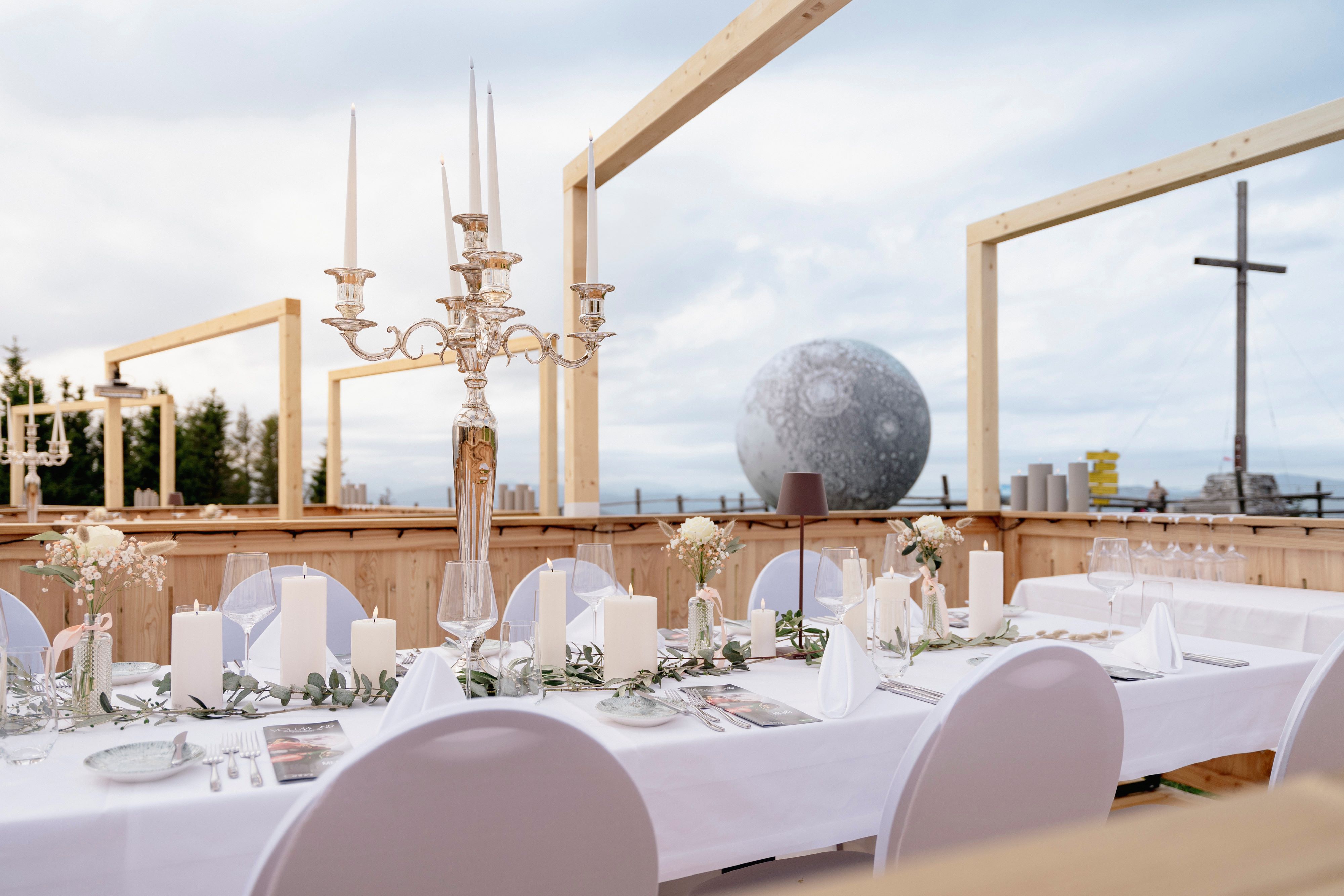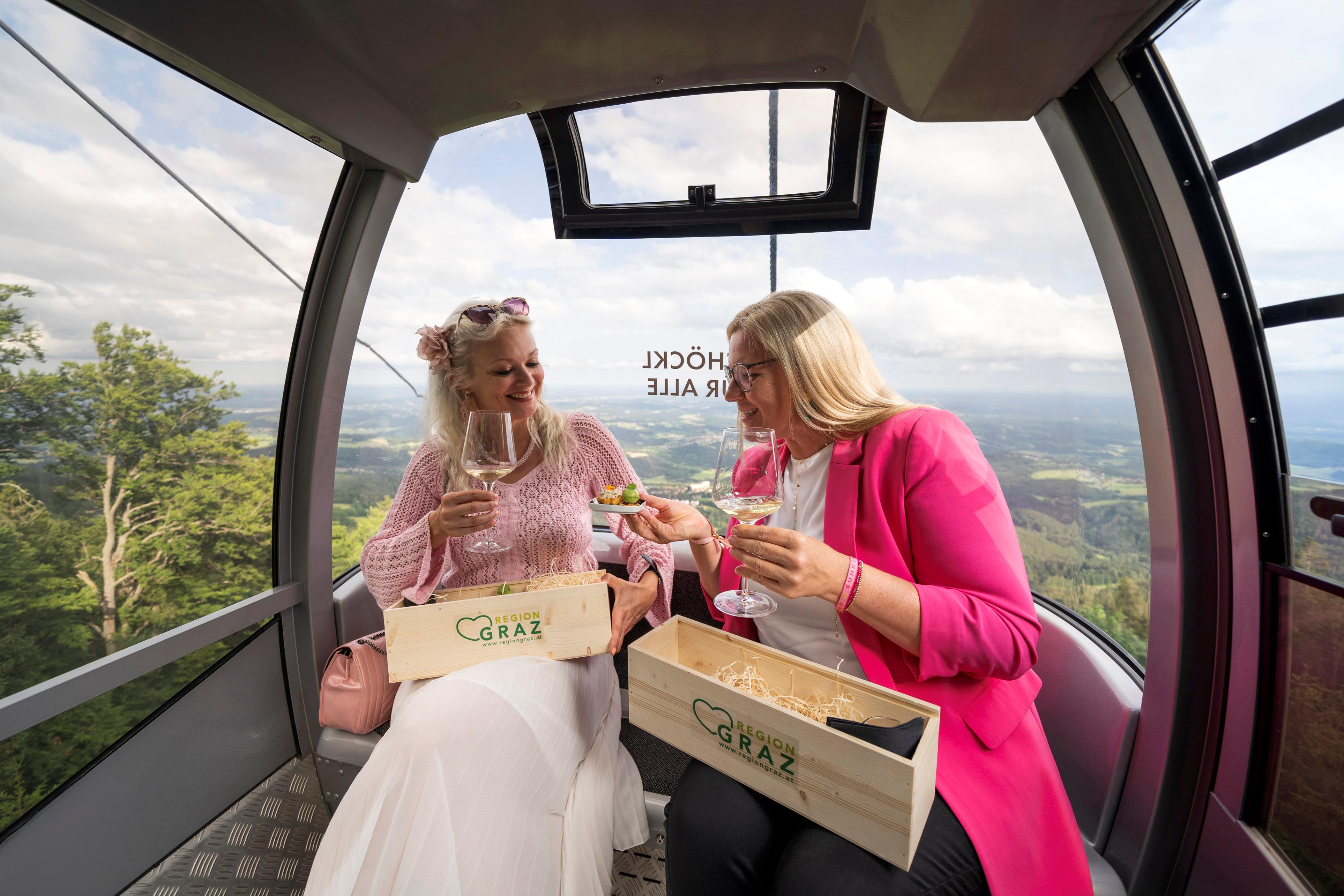 Der Aperitif und Gruß aus der Küche wurden bereits in der Gondel mit atemberaubender Aussicht auf die Erlebnisregion Graz eingenommen. Mit musikalischer Begleitung ging es anschließend in einem gemeinsamen Fußmarsch zum Westgipfel, wo die von den Schülern der Tourismusschule Bad Gleichenberg stilvoll eingedeckten Tische auf die Gäste warteten und Alphornbläser für den perfekten musikalischen Rahmen sorgten.