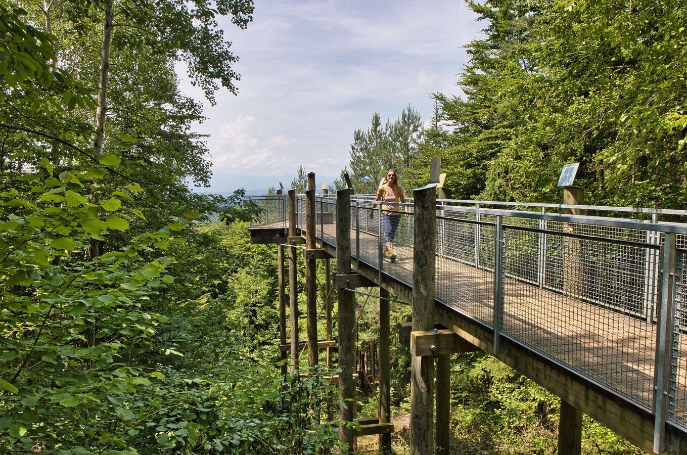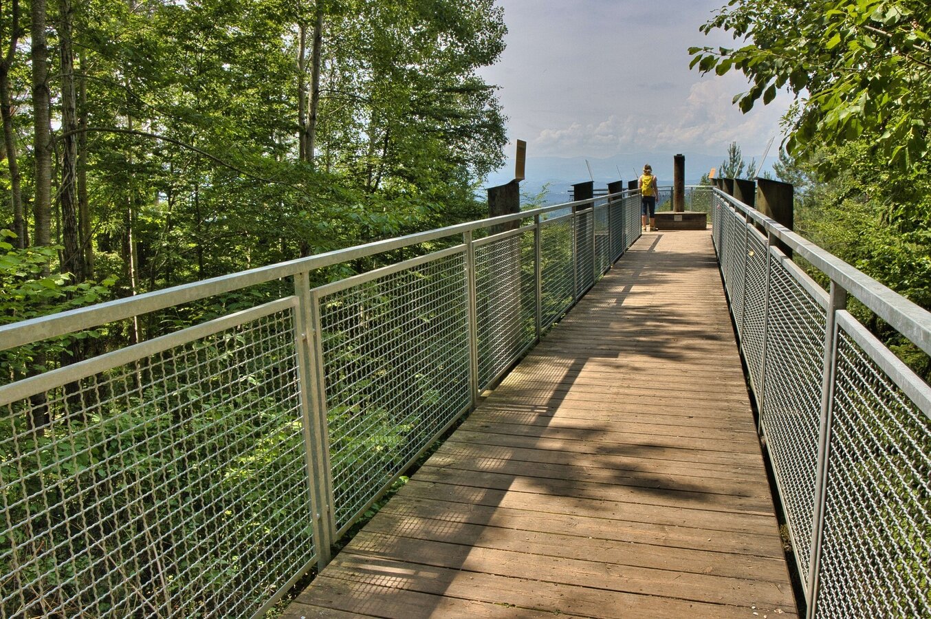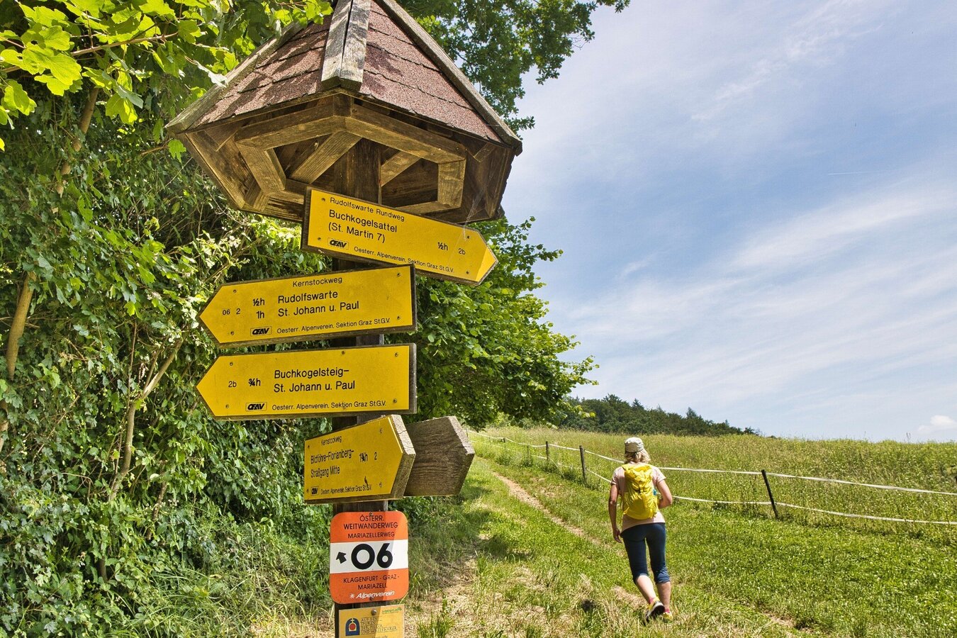 Hike-Tour führt durch einen von vielen Wanderwegen durchzogenen Laubwald. Die Wege sind gut markiert und beschildert, sodass meist viele Wanderer, Spaziergänger, Läufer und auch Radfahrer unterwegs sind. Die paar Stufen auf die kleine runde Plattform der Kronprinz-Rudolf-Warte am Buchkogel sind unbedingt zu gehen, da die Aussicht auf die Stadt Graz beeindruckend ist. Von der zweiten Aussichtsplattform sehen wir in Richtung Westen, wobei eine Orientierungstafel bei der Bestimmung der Gipfel sehr hilfreich ist.