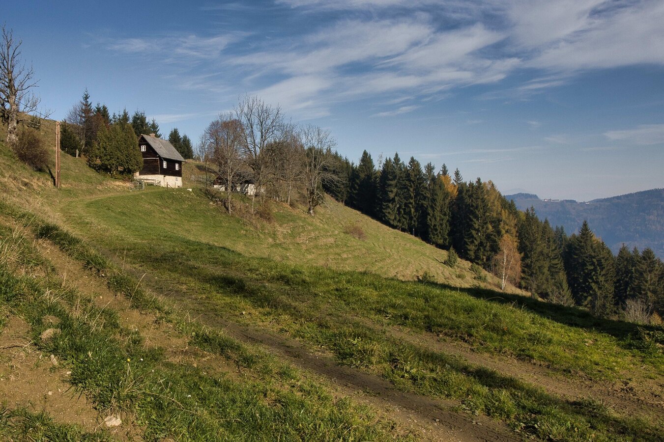 Der Abschnitt beginnt am Bahnhof Übelbach (580 m) und führt zunächst gemütlich durch den Ort und unter der Autobahnbrücke hindurch, bevor ein naturnaher, waldreicher und langer Anstieg beginnt. Am Taschlerkreuz mit seiner aussichtsreichen Alm angekommen, verläuft die Route weiter in Richtung Osten auf breiten Wegen und Forststraßen mit herrlichen Ausblicken. Entlang des Höhenweges prägen zahlreiche Wegkreuze das Landschaftsbild und laden zum Verweilen ein – darunter das Hiednerkreuz (flux Haltepunkt GU 1162 Großstübing-Gh Hiedner), das Ederkreuz (flux Haltepunkt GU1839 Übelbach-Ederkreuz) und das Wartkogelkreuz, sowie ein Gedenkstein mit einem Kreuz oberhalb von vlg. Sprinzelhofer. Die Strecke bietet eine reizvolle Mischung aus offenen Kulturflächen mit weitem Panorama und dichten, gepflegten Wäldern. Der letzte Anstieg führt hinauf auf den Schartnerkogel (931 m), der mit seiner kleinen, aber eindrucksvollen Hochfläche einen herrlichen Ausblick freigibt. Der Abstieg erfolgt größtenteils über schmale Waldsteige hinunter ins Tal bis Deutschfeistritz (404 m). Von dort geht es gemütlich durch den Ort, über die Mur und schließlich zum Bahnhof Peggau – dem Ziel dieses Abschnitts.