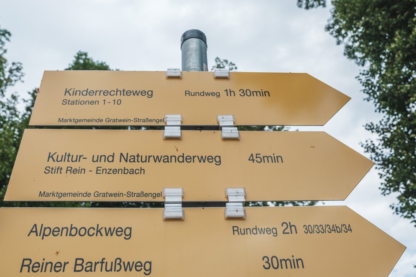 Vom Stift Rein aus folgt man dem gelben Wegweiser mit der Aufschrift „Kinderrechteweg“, der ein Stück lang parallel zum „Kultur-Naturweg“ verläuft.