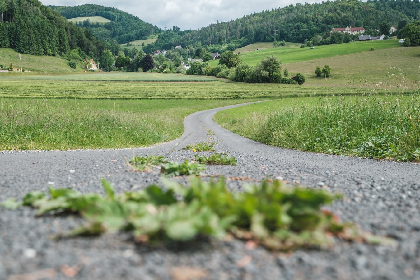 Auf einer leicht ansteigenden Straße kommt man an Wiesen, Feldern und historischen Bauwerken vorbei.