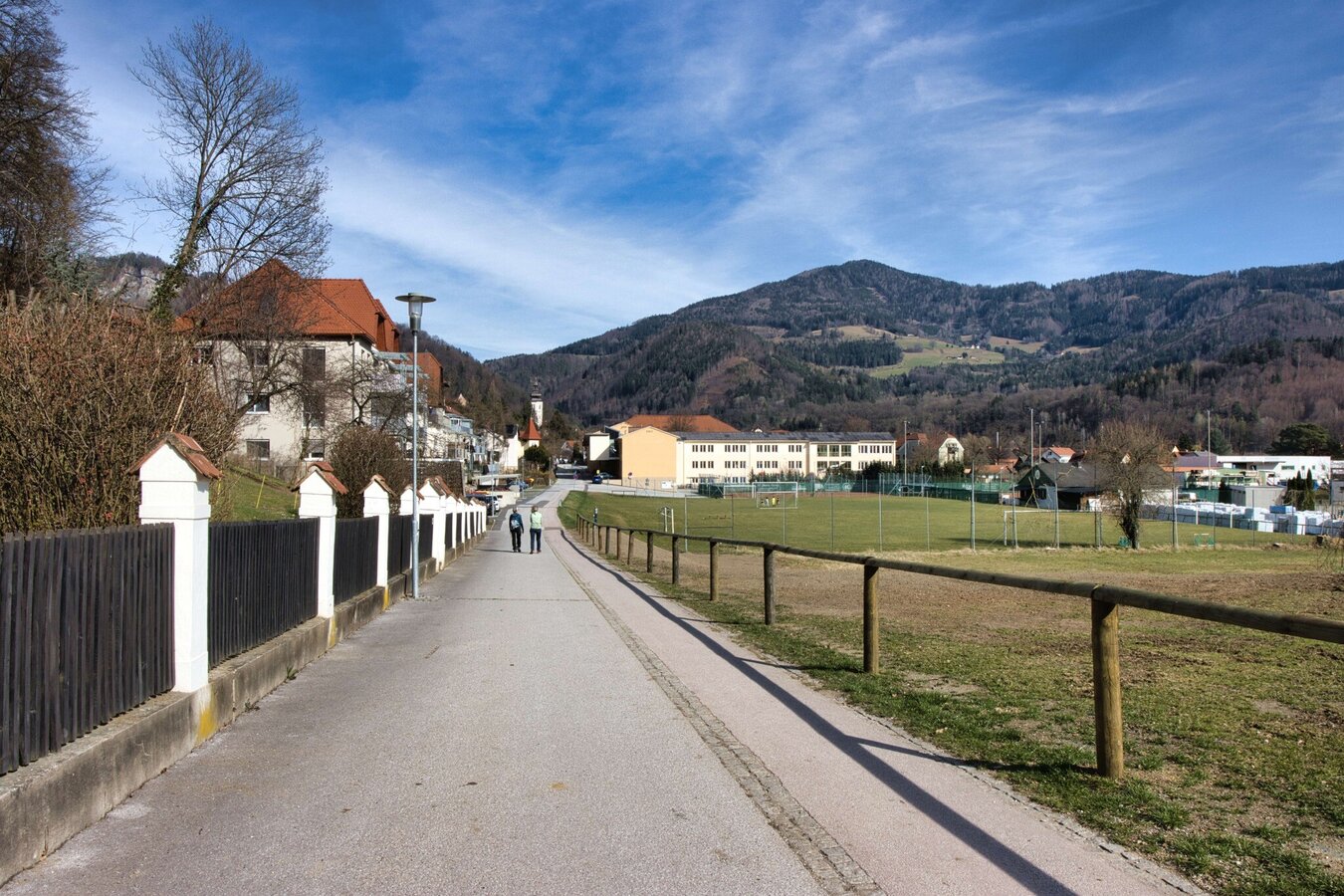 Wohngebiet zum Schulzentrum und schließlich leicht ansteigend zurück zum Hauptplatz