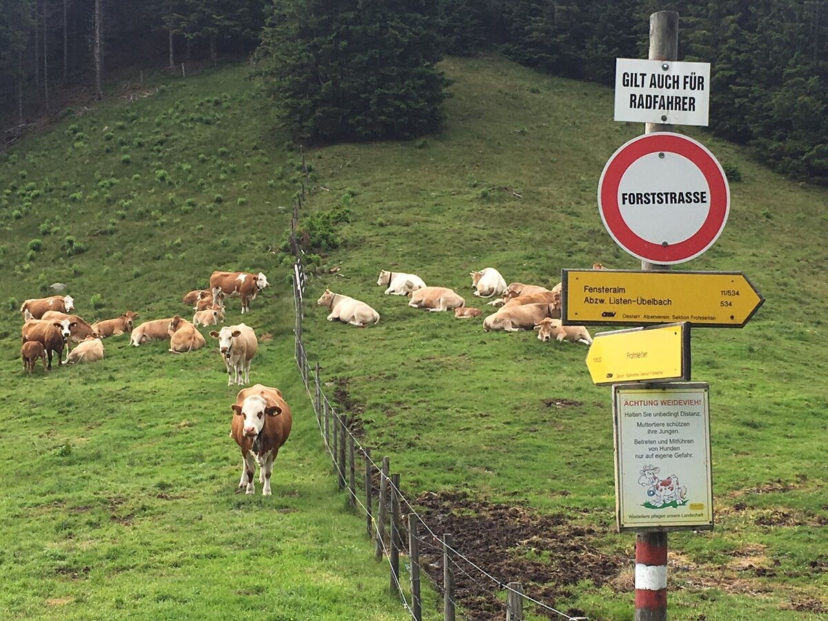 Vom Übelbacher Alten Markt stoßen wir die Kalvarienbergstraße hinauf, zweigen nach links ab und marschieren im Wald hoch bis zum Listkogel. Der markierte Weg 534 wird einige Male durch die Forststraße unterbrochen. Oben passieren wir den Bildstock und das ehemalige Gasthaus Hubertushof, halten uns nach den Garagen links und wandern in westlicher Richtung zur Plotscherbauerhütte weiter. Von dort geht es auf dem Weg 11 zur Gmoa-Alm und weiter über den Weg 532 zum Ebenwirt am Schenkenberg; dann auf dem Weg 533 über den Haneggkogel und den Reising zum Sieglkreuz und zum Poidlwirt. Von hier sind es noch ca. 1,5 Stunden zur S-Bahn-Haltestelle 11 Zitoll.