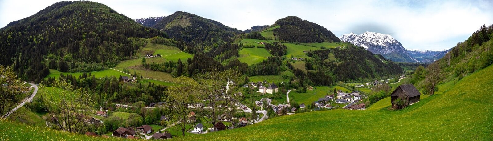 Durch grüne Wiesen und entlang des Raumbergwegs gelangst du schließlich zum Donnersbach, dem du bis zum Ortseingang von Donnersbach folgst. Im Ortszentrum bzw. schon am Ende biegst du rechts ab Richtung Kleinwasserkraftwerk und folgst dem Fuchsbergweg – eine ruhige Passage mit weitem Blick.