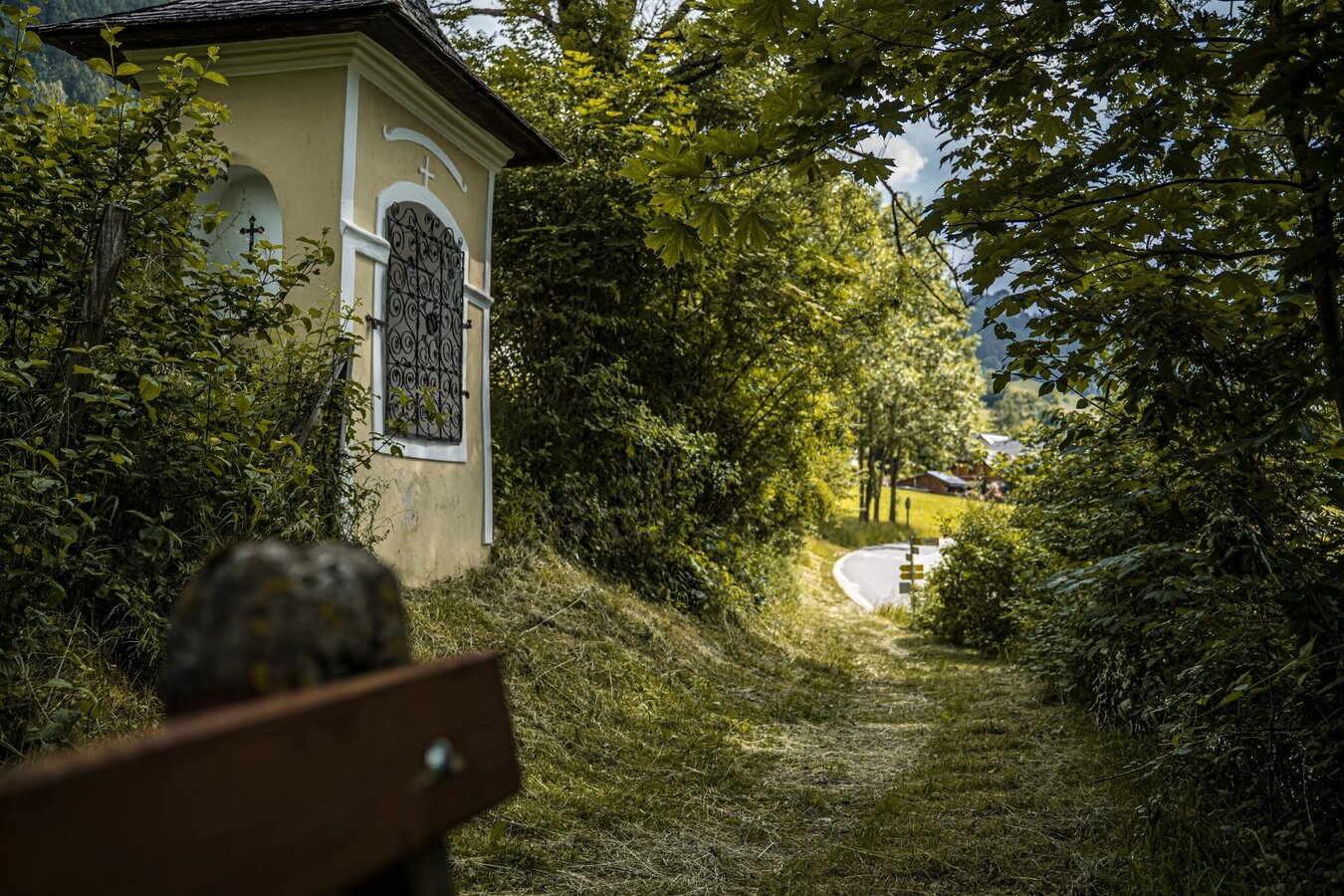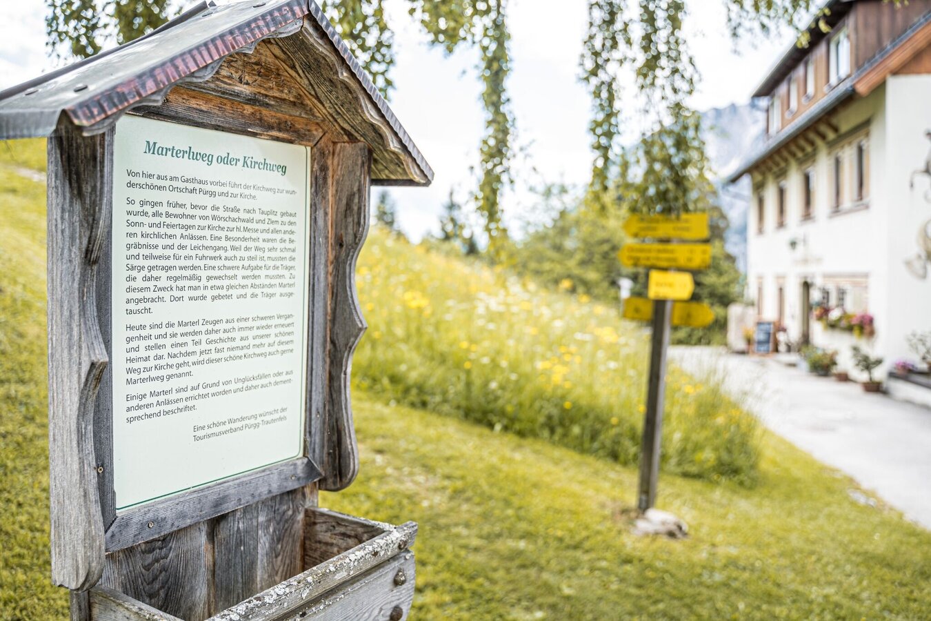 Durch den Ort hindurch bietet sich ein Blick auf die markante Felsformation der Trautenfelser Kletterwand. Nach der Überquerung der Bundesstraße führt der Waldesruhweg durch Wälder und Wiesen. Nach dem Überqueren der Bahnstrecke läufst du ein kurzes Stück auf der Straße Richtung Pürgg, biegst jedoch bald links ab und folgst dem Marterlweg in einer langgezogenen Serpentine bergauf.