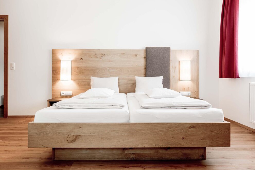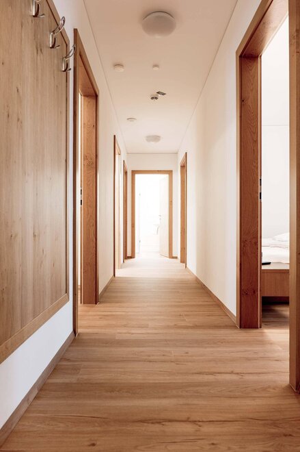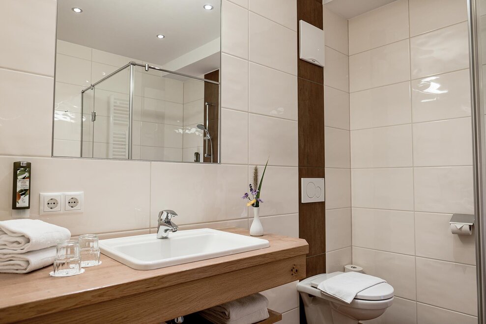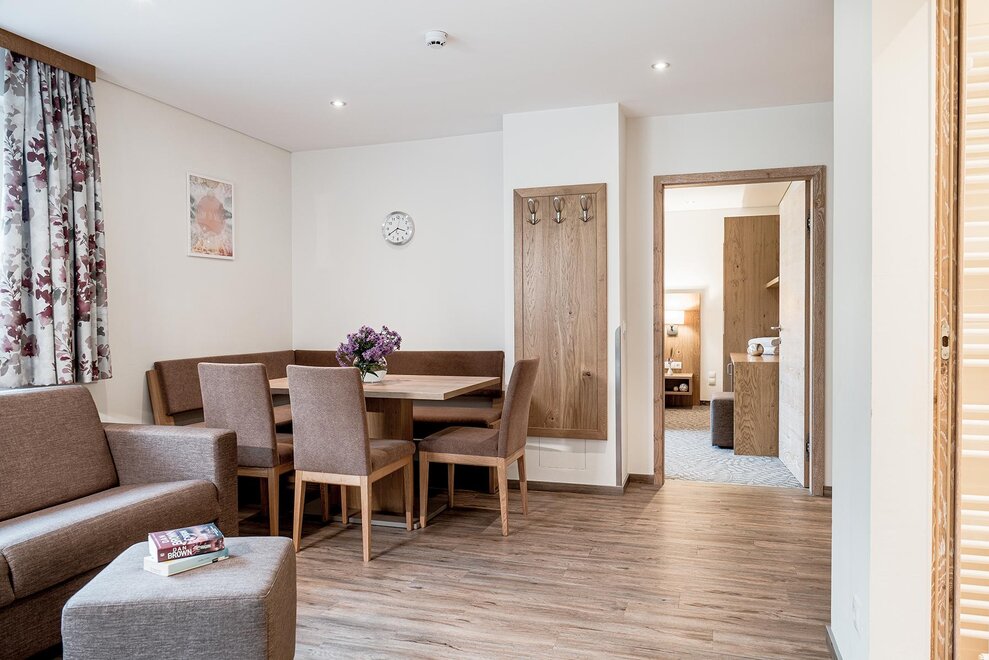 Appartement für 4-5 Personen mit ca. 60 m² Wohnfläche. Das Appartement Deluxe verfügt über 2 Schlafzimmer mit je einem Doppelbett und zusätzlicher Schlafcouch für 1-2 Personen, 2 Badezimmer mit Dusche und WC, Vorraum, Wohnküche mit Essbereich und vollausgestatteter Küche mit Kühlschrank/Gefrierfach, Mikrowelle, Ceran-Kochfeld, Kaffeemaschine, Geschirrspüler, Kochutensilien und Geschirr. Alle Appartements und Zimmer sind mit Telefon, TV, Safe, Föhn und WLAN Internet ausgestattet.