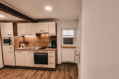 Die Küche ist mit Backofen, einer Kaffeemaschine, Wasserkocher einer Doppelkochplatte, einer Mikrowelle und Geschirrspüler ausgestattet.