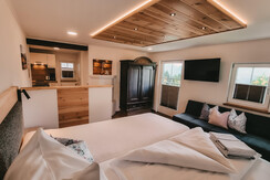kleines Studio Appartement im Bauernhaus mit offenem Wohn- Schlafbereich, Küche mit Esstisch und Kachelofen. Der Balkon Richtung Nord/West bieten eine grandiosen Blick auf das Dachstein Gebirge