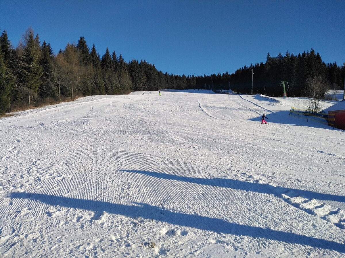 • Wir starten unseren Winterspaziergang am Fischbacher Dorfplatz und wandern entlang der Dorfstraße Richtung Norden leicht bergauf vorbei am Museum für bäuerliches Handwerk bis wir nach dem Kräuterhof Zemanek (auf der rechten Straßenseite) links zum Skilift abbiegen