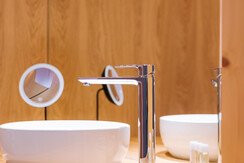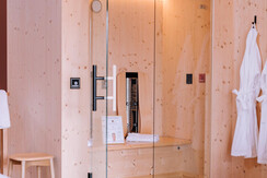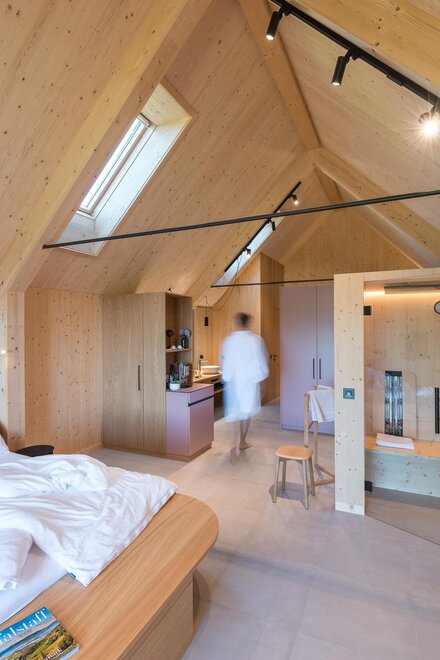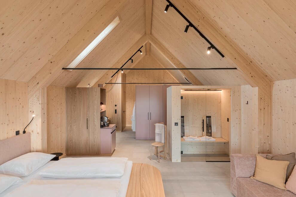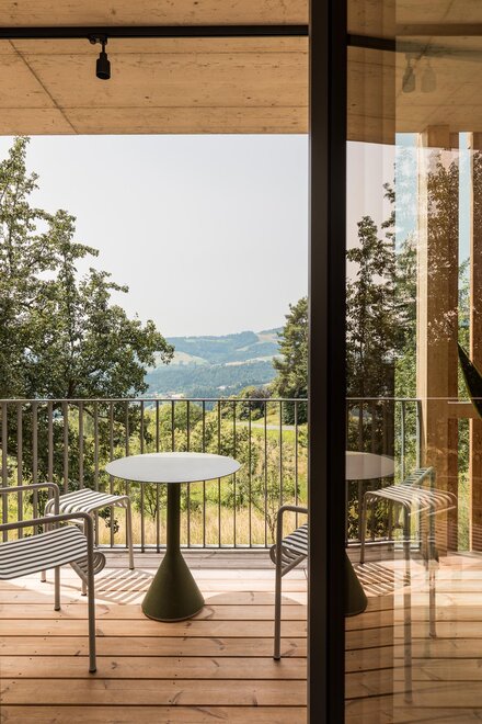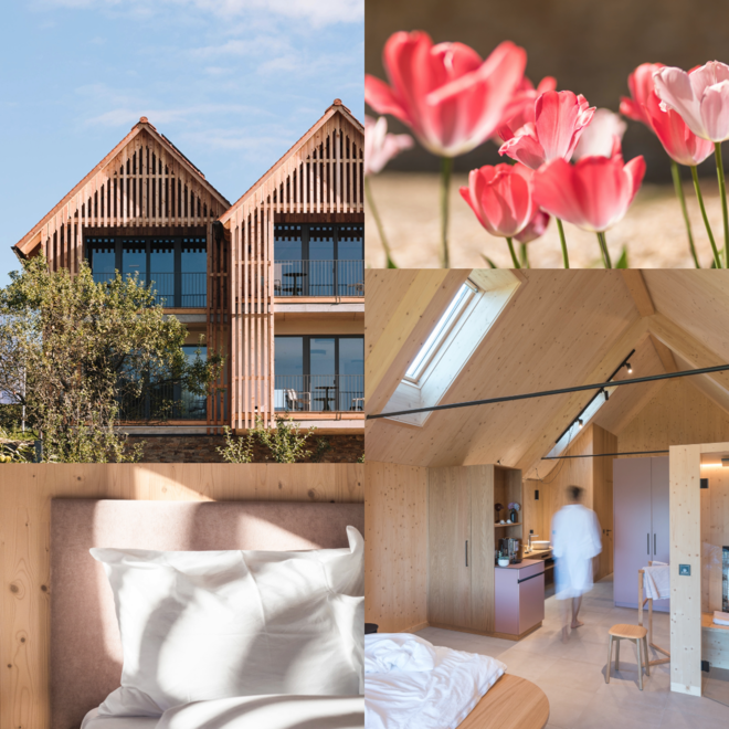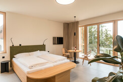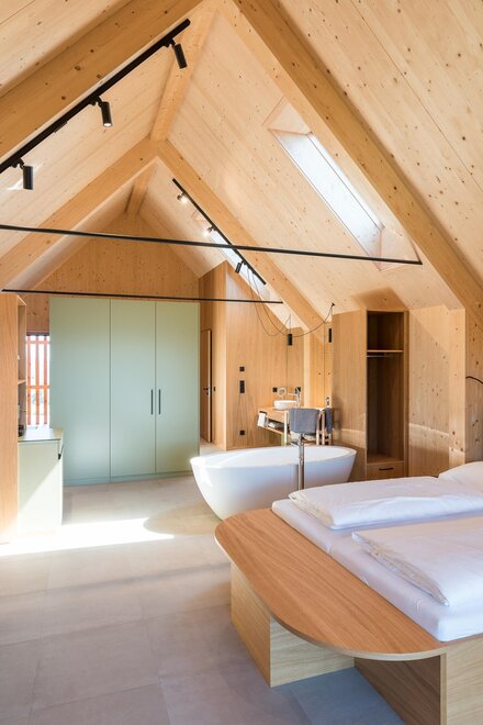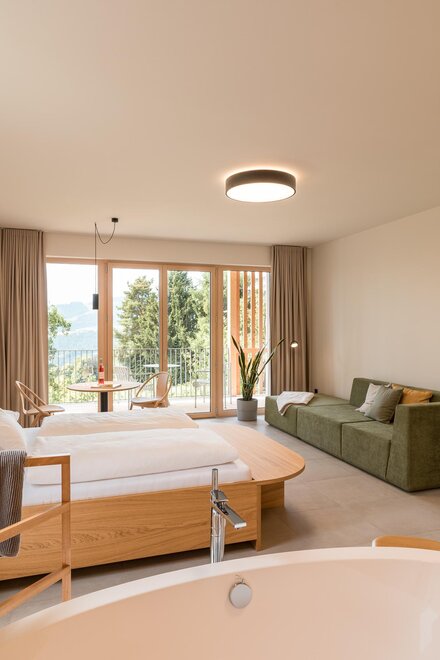 Genieße den traumhaften Ausblick über die Hügellandschaft, vom Zimmer aus, auf unserem sonnigen Balkon oder aus der frei stehenden Badewanne. Die offene Raumgestaltung bietet stilvollen Luxus für zwei.