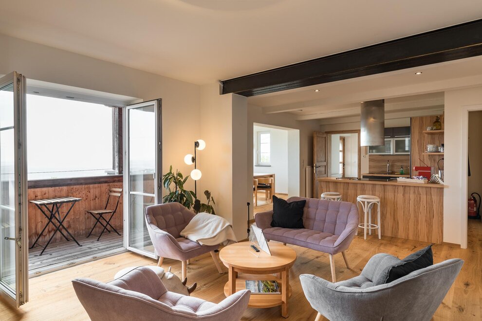 Die große und offene Küche lädt zum Kochen ein und der sonnige Essbereich bietet viel Platz zum Gustieren und Schmausen. Auf dem Balkon kann man den Blick in die Ferne schweifen lassen und wunderbare Sonnenaufgänge genießen.