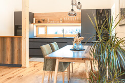 Ein geölter Eichenboden und eine Bodenheizung im gesamten Ferienhaus lassen Sie idyllisches Raumklima spüren. Genießen Sie romantische Abende bei einem Gläschen Wein auf dem gemütlichen Sofa mit Blick auf das lodernde Kaminfeuer. Verwöhnen Sie Ihre Liebsten mit einem selbstgekochten Gaumenschmaus in der voll ausgestatteten Küche. Frisches Gemüse und frische Kräuter aus dem Hausgarten runden Ihre Gerichte ab.