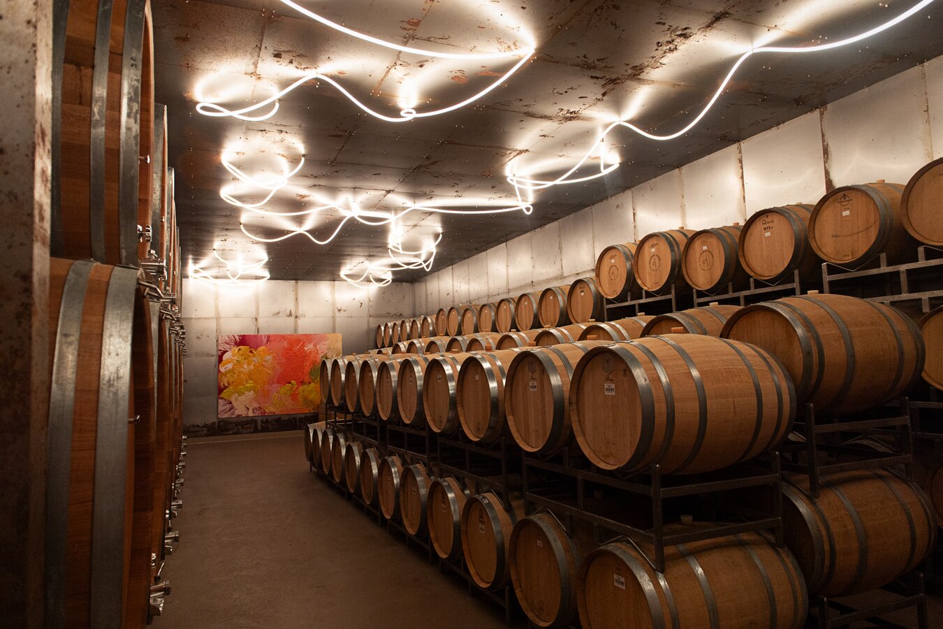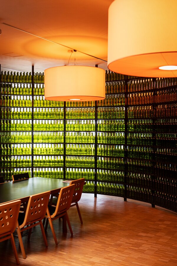 Auch architektonisch ist das Weingut ein Erlebnis: Schlichte Materialien wie Sichtbeton, Ulmenholz und Glas schaffen klare Linien, viel Holz, kein Schnickschnack – hier darf der Wein die Bühne haben. Besonders eindrucksvoll ist der lichtdurchflutete Verkostungsraum mit einer Wand aus tausenden Weinflaschen. Weinverkostungen sind gegen Voranmeldung jederzeit möglich.