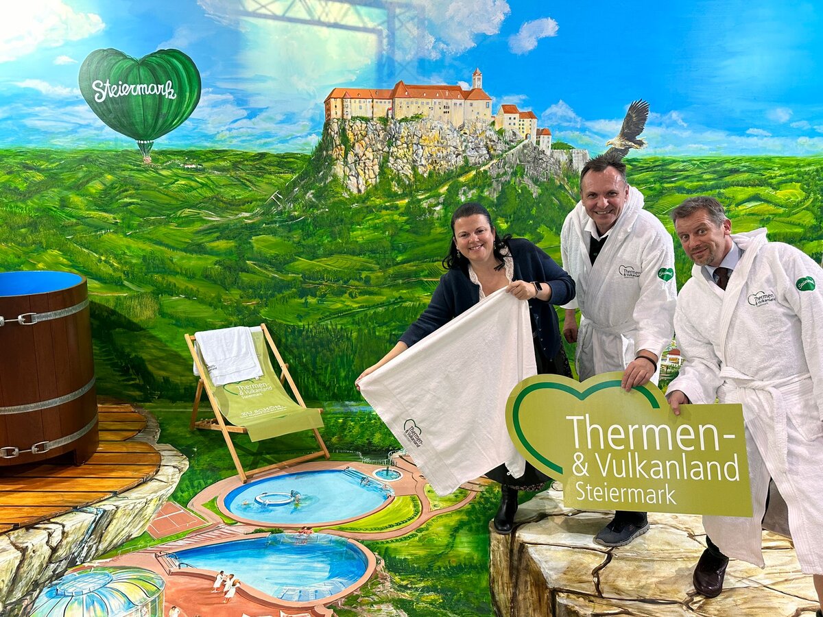 Sehr positiv kann die Erlebnisregion Thermen- & Vulkanland auf die Ferienmesse 2024 in Wien zurückblicken. Tausende interessierte Besucher:innen informierten sich an den vier Messetagen über unsere Region, die mit einem riesengroßen 3D-Kunstbild und einer Sauna auf sich aufmerksam gemacht hat. Das Thermen- & Vulkanland präsentierte sich gemeinsam mit folgenden Betrieben auf der Ferienmesse: Die Therme der Ruhe, Thermenresort Loipersdorf, Heiltherme Bad Waltersdorf, H2O Hotel-Therme-Resort, Thermalhotel Leitner, Hotel Kowald Loipersdorf, DAS SONNREICH Loipersdorf, Spa Resort Styria, Wilfinger Bio Thermen Hotel und Der Steirerhof.