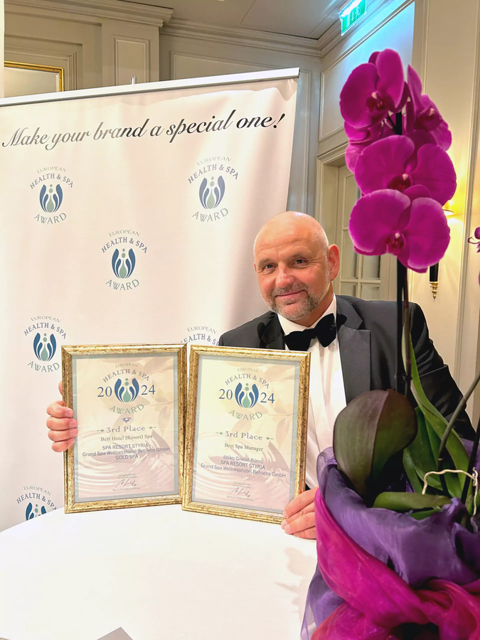 Doppelte Freude herrscht im Spa Resort Styria in Bad Waltersdorf. Bei den diesjährigen European HEALTH & SPA AWARDs schaffte das Hotel gleich in zwei Kategorien - "Best Hotel (Resort) Spa" und "Best Spa Manager" - jeweils den 3. Platz. „Das Spa Resort Styria ist stolz darauf, bei den „Oscars“ der SPA-Branche in gleich zwei Kategorien jeweils Bronze erreicht zu haben. Diese Anerkennung spiegelt unsere kontinuierliche Bemühung wider, höchste Qualität und exzellenten Service zu bieten. Wir danken unserem engagierten Team und unseren treuen Gästen, die zu diesem Erfolg beigetragen haben.“ sagt Thomas Gneist, Geschäftsführer des Spa Resort Styria.