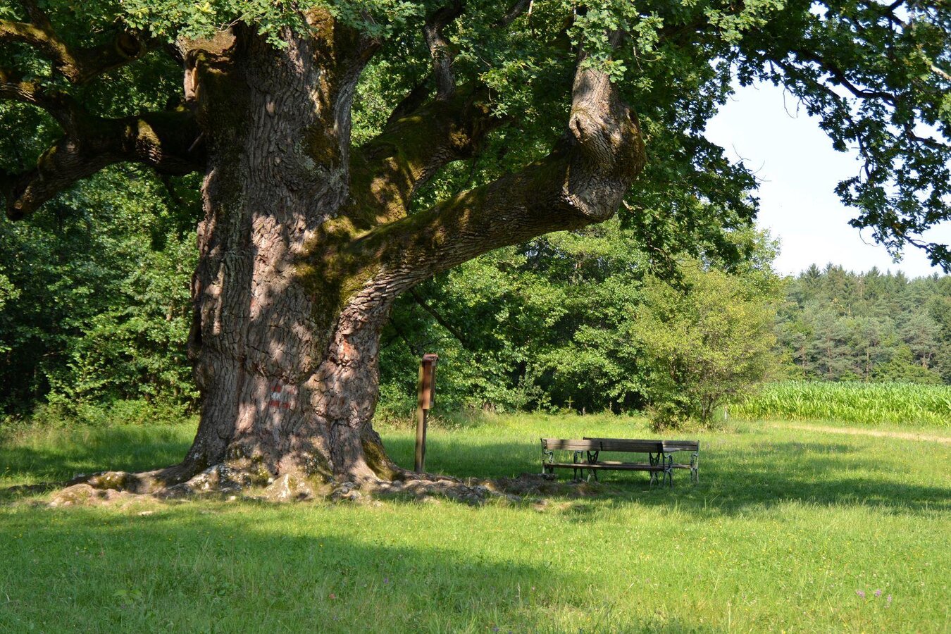 - 1000jährigen Eiche. Beim Kraftplatz unter der Baumkrone (Durchschnitt ca. 50 m) innehalten und eine Rast beim Picknickplatz einlegen. Dem Weg Richtung Loimeth (Waldrand und Wald) folgen und den Geräuschen der Bäume und Vögel lauschen. Am Waldende rechts den Ort Loimeth entdecken. Bei der Kreuzung rechts und dann links in den Eichelweg aus dem Ort gehen.