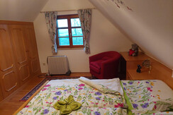 Das einladende Ferienhaus bietet zwei Schlafzimmer, die jeweils mit einem gemütlichen Doppelbett ausgestattet sind und sich im Obergeschoss befinden. Bettwäsche ist vorhanden. Über eine Wendeltreppe aus Holz gelangen Sie vom Erdgeschoss in oberen Stock, in dem sich ebenfalls ein WC mit kleinem Handwaschbecken befindet. Eine zusätzliche Schlafgelegenheit für eine fünfte Person bietet die ausziehbare Couch im Wohnzimmer. Von dort gelangen Sie direkt auf die großzügige Terrasse mit Sitzgelegenheiten, einem Grill und dem gepflegten Garten, der das Haus umgibt.