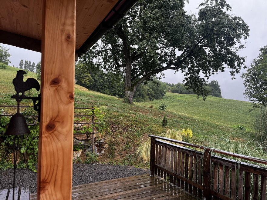 Schlafzimmer im Obergeschoß mit Doppelbett mit Ausblick in die Hügellandschaft. WC im Obergeschoß ist separiert.
