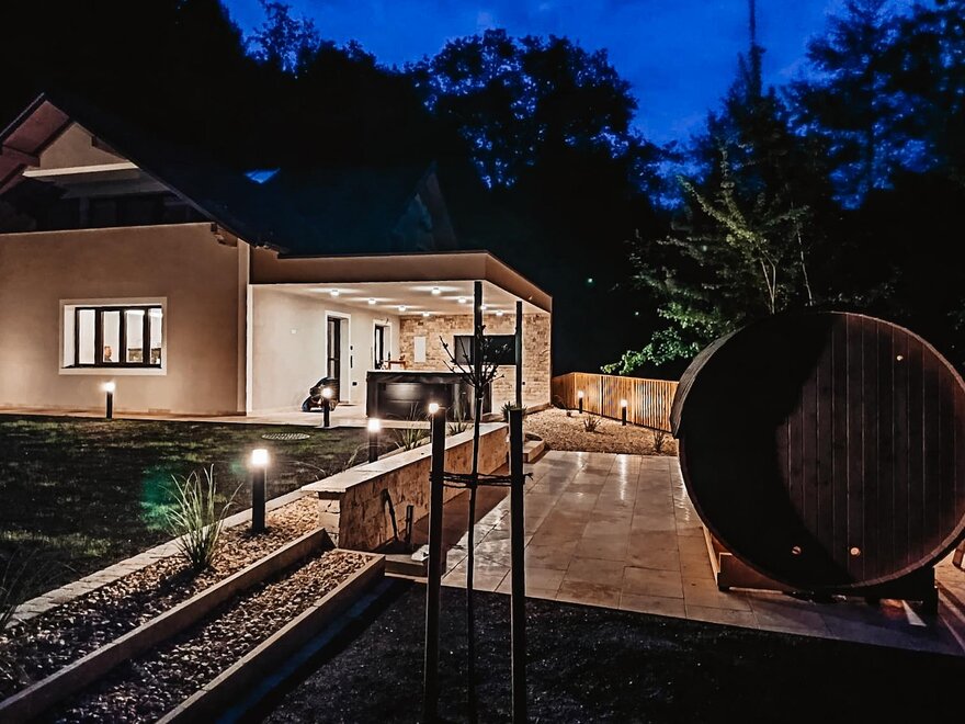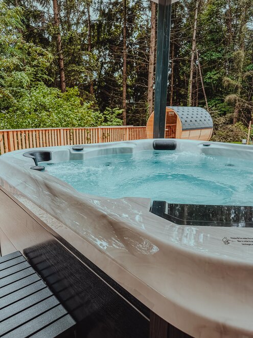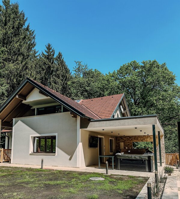 Ferienhaus im Grünen für bis zu 8 Personen mit großem Garten, Terrasse mit Whirlpool, Außensauna und Außendusche.