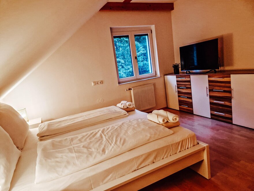 Unsere wunderschöne Villa Waldblick verfügt über eine voll ausgestattete Küche, 4 Doppelzimmer und 3 Bäder, sowie einem großen Wohnraum/Esszimmer.