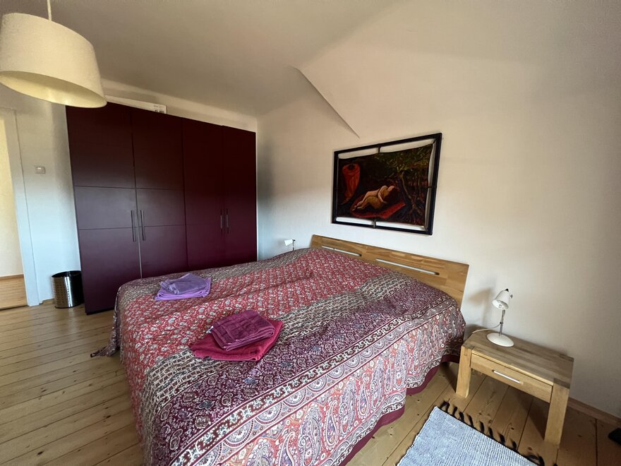 Das 86 m2 große Ferienappartement im ersten Stock des Chalets besteht aus zwei Schlafzimmern mit jeweils 1,80m breitem King Size Bett (jeweils mit Balkon mit Aussicht). Eines der beiden großen Schlafzimmer hat eine Doppelfunktion als Esszimmer (Tisch für 8 Personen), im anderen Zimmer befindet sich zusätzlich zum King Size Box-Spring-Bett ein hochwertiges Schlafsofa mit 1,70m breitem vollwertigem französischen Bett; sowie einem kleinen Schlafzimmer mit einem 1,40m breiten Doppelbett. Das Appartement verfügt über ein Badezimmer mit Dusche, WC und Doppelwaschbecken, sowie ein separates WC. Die Küche ist überkomplett ausgestattet.