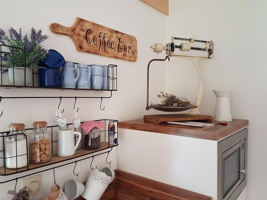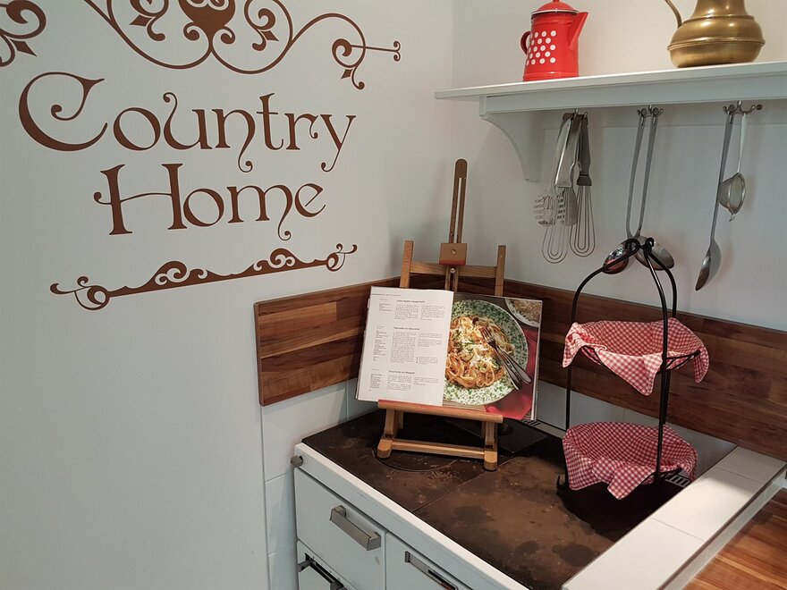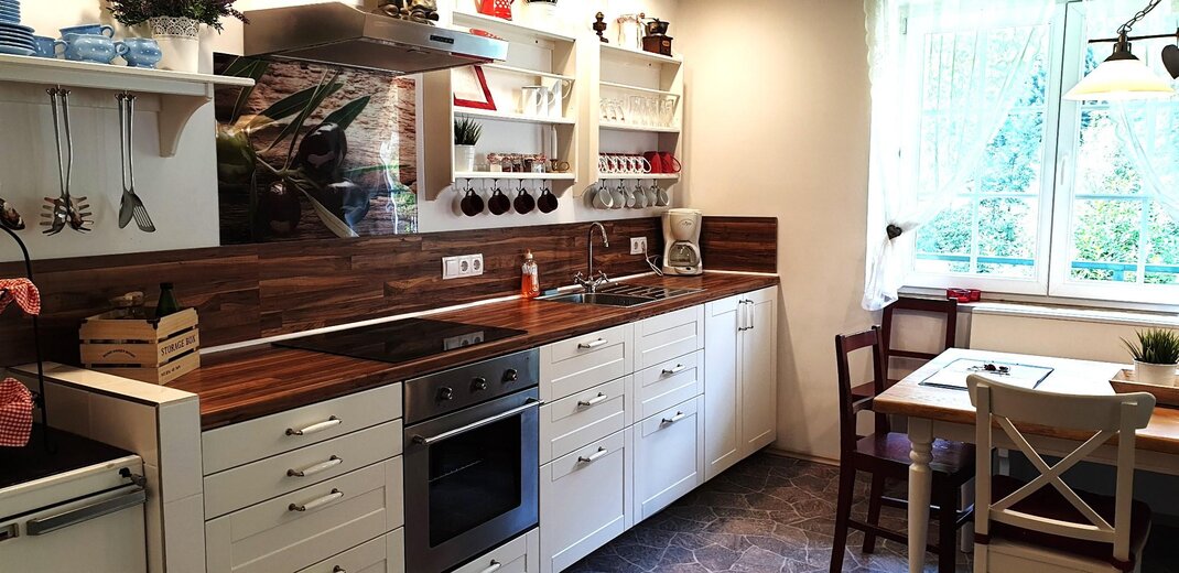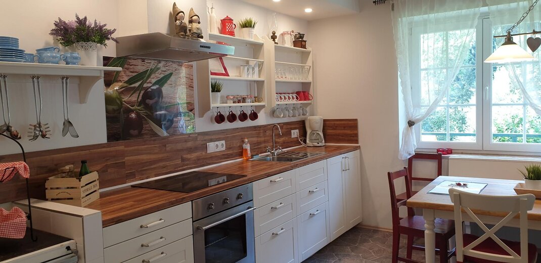 * Große Wohnküche mit Küchenzeile und großem Esstisch für 7-9 Personen - komplett eingerichtet mit E-Herd mit Backofen, Mikrowelle, Kühlschrank, Geschirrspüler, Kaffeefiltermaschine, komplette Geschirrausstattung mit Tischwäsche