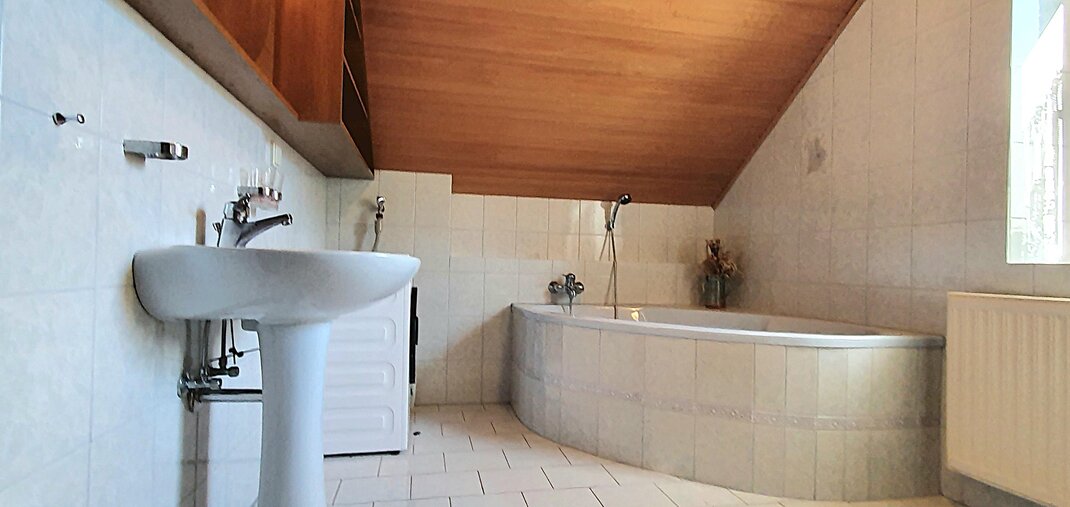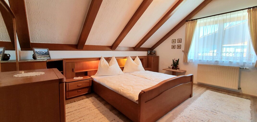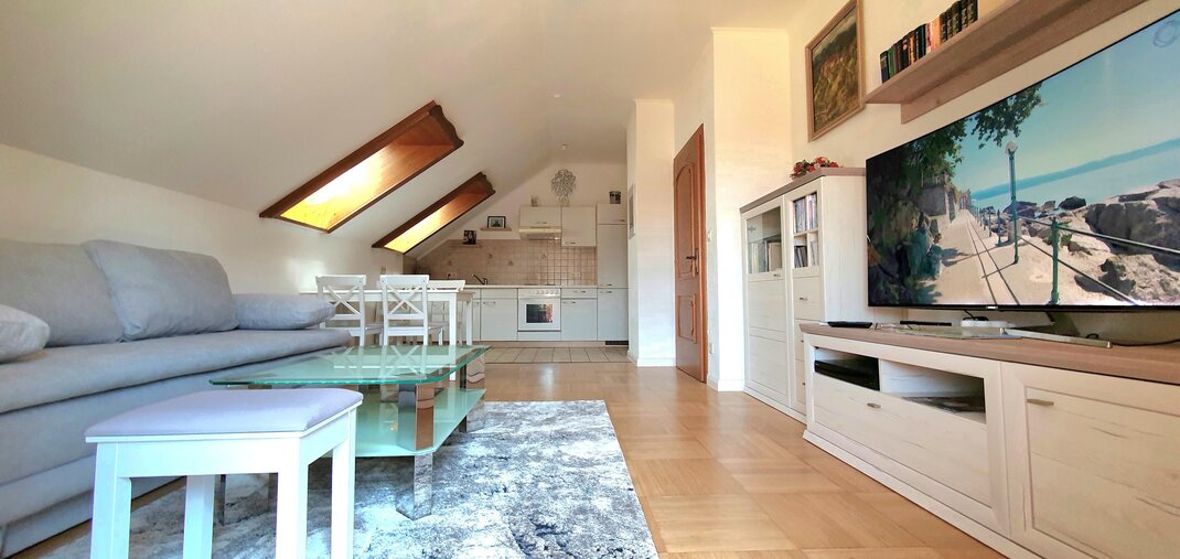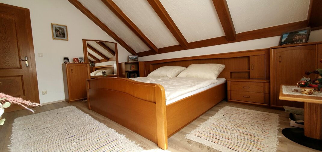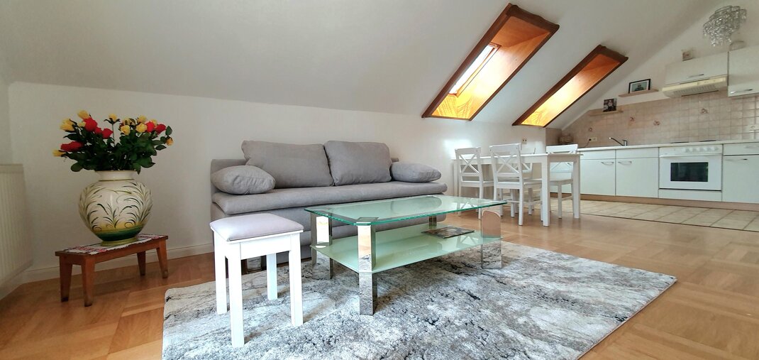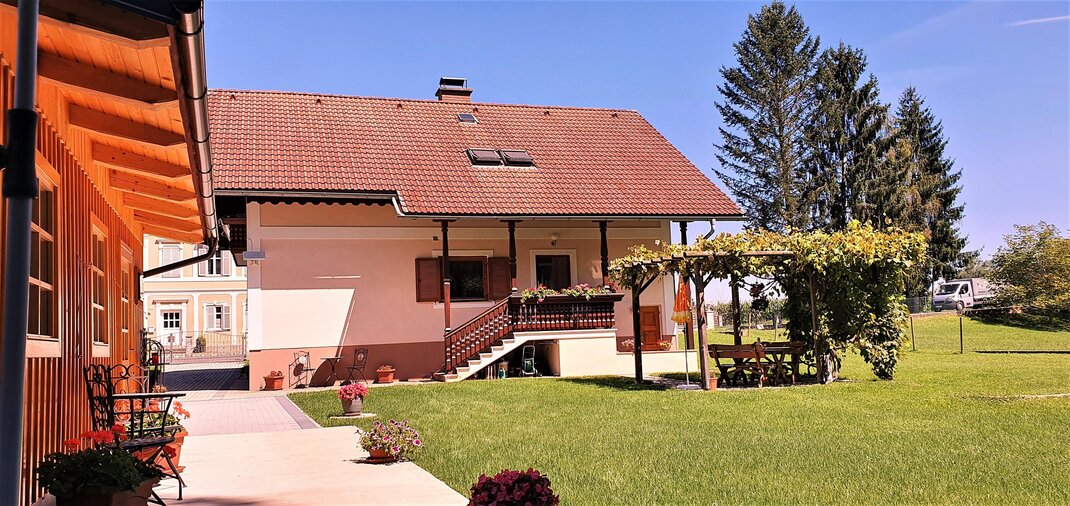 Im Dachgeschoß befindet sich eine zweite modern nostalgisch eingerichtete Ferienwohnung (73m2) Wohnzimmer mit offener Küche und Essplatz, geräumigen Schlafzimmer, Bad, Dusche, WC und Waschmaschine und großem Südwestbalkon mit Blick auf die Murauen und Schloss Obermureck für 4 Personen. In den Wohnungen ist ein DVD-Player mit einem umfangreichen CD und DVD-Sammlung vorhanden. Auf Wunsch bieten wir auch einen Brötchen Service der slowenischen Mura – Bäckerei für unsere Gäste an.
