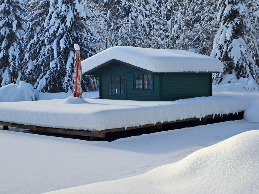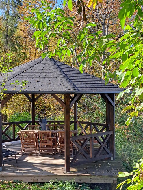 Zum Verweilen und zum Zeitvertreib stehen den Gästen ein Gärtchen, ein Pavillon mit Ausblick, ein Swimmingpool und eine Fischerhütte am Teich zur Verfügung.