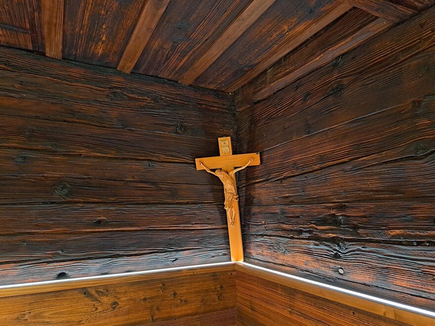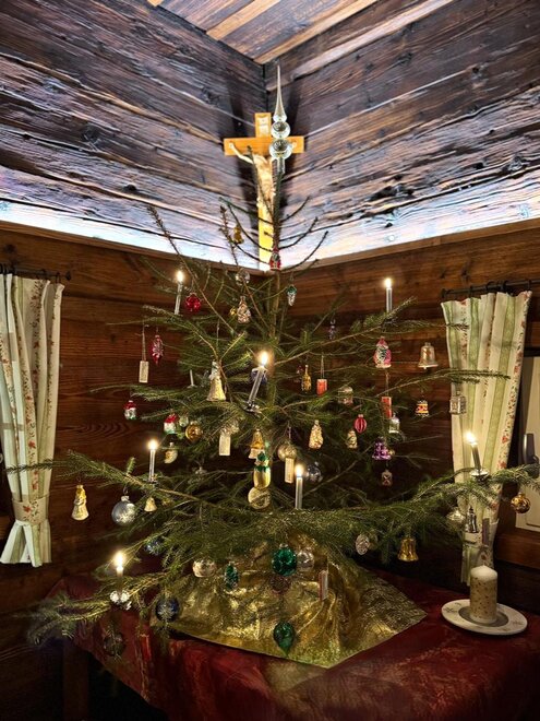 Das Feuer knistert im großen Ofen. Der glitzernde Christbaum steht in der Ecke unter dem Jesus Kreuz.