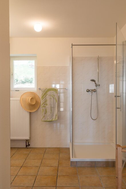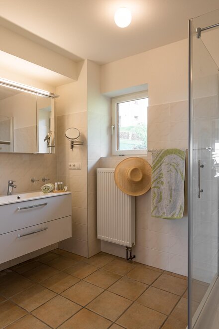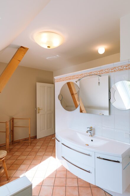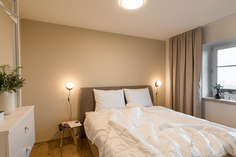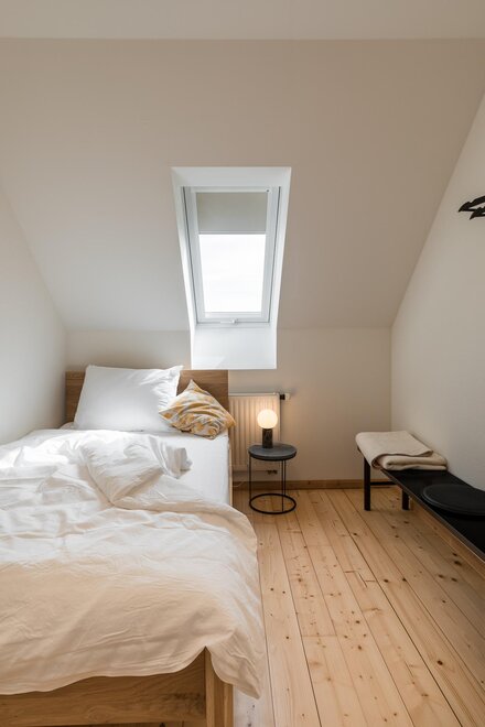 In den zwei Schlafzimmern sorgen gemütliche Doppelbetten für erholsame Nächte. Zusätzlich gibt es ein Einzelzimmer. Das große Badezimmer wartet mit einer Walkin Dusche und einer Badewanne auf. Wenn man entspannt in der Badewanne liegt, kann man durch das Dachflächenfenster den Himmel beobachten und die Seele baumeln lassen.