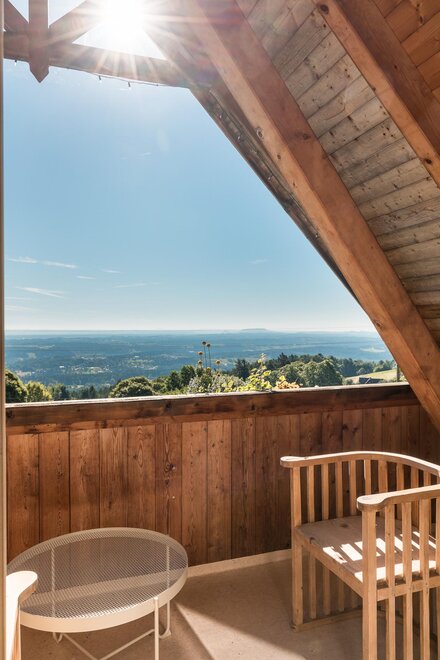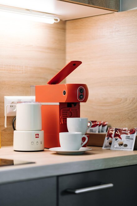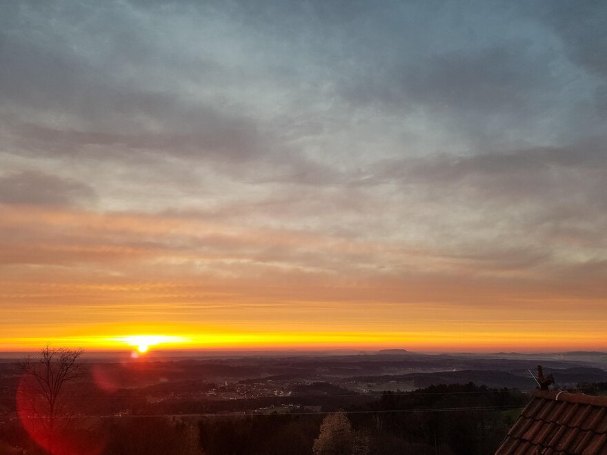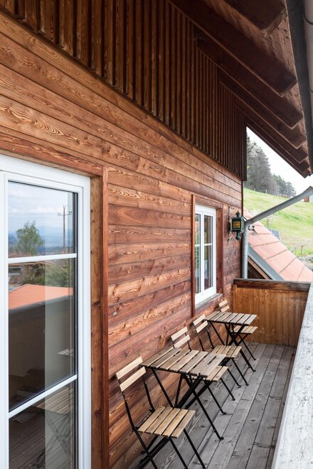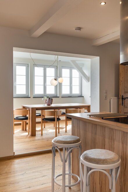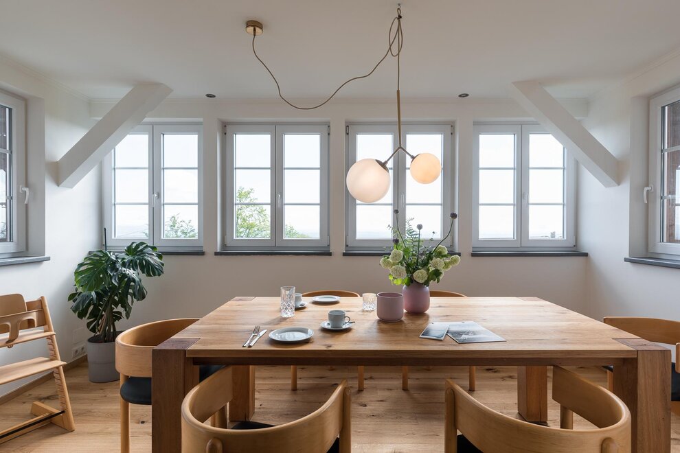 Die große und offene Küche lädt zum Kochen ein und der sonnige Essbereich bietet viel Platz zum Gustieren und Schmausen. Auf dem Balkon kann man den Blick in die Ferne schweifen lassen und wunderbare Sonnenaufgänge genießen.
