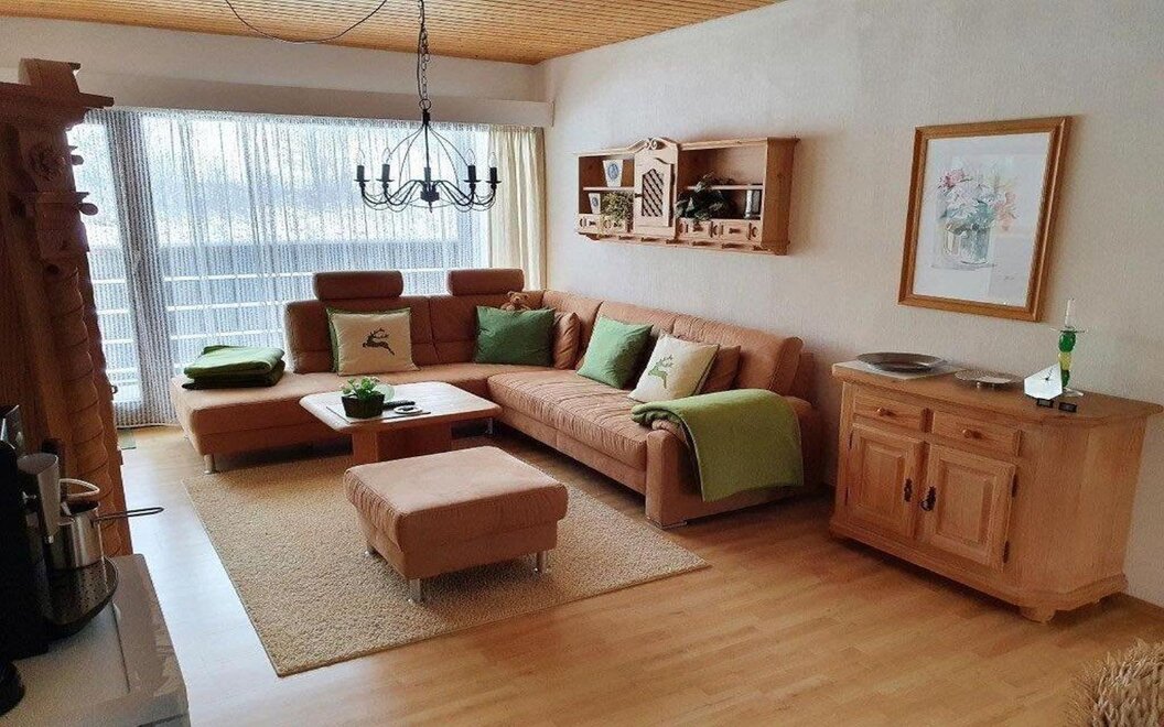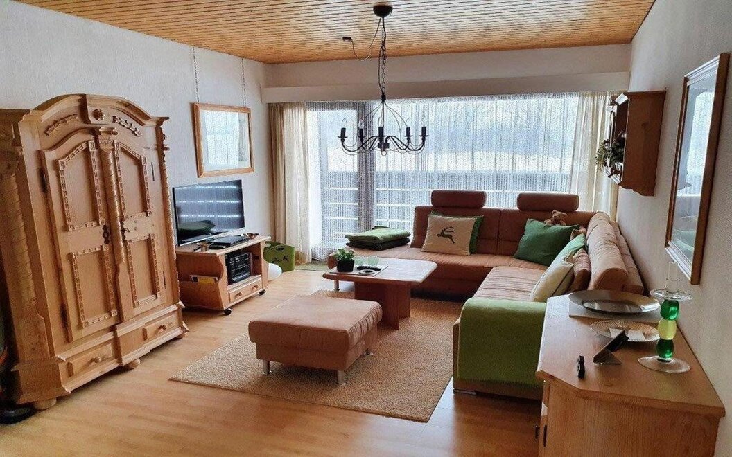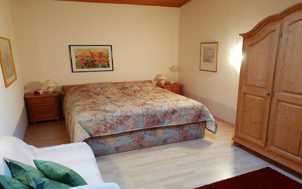 The holiday apartment features two bedrooms with double beds, a living room, and a well-equipped kitchen.