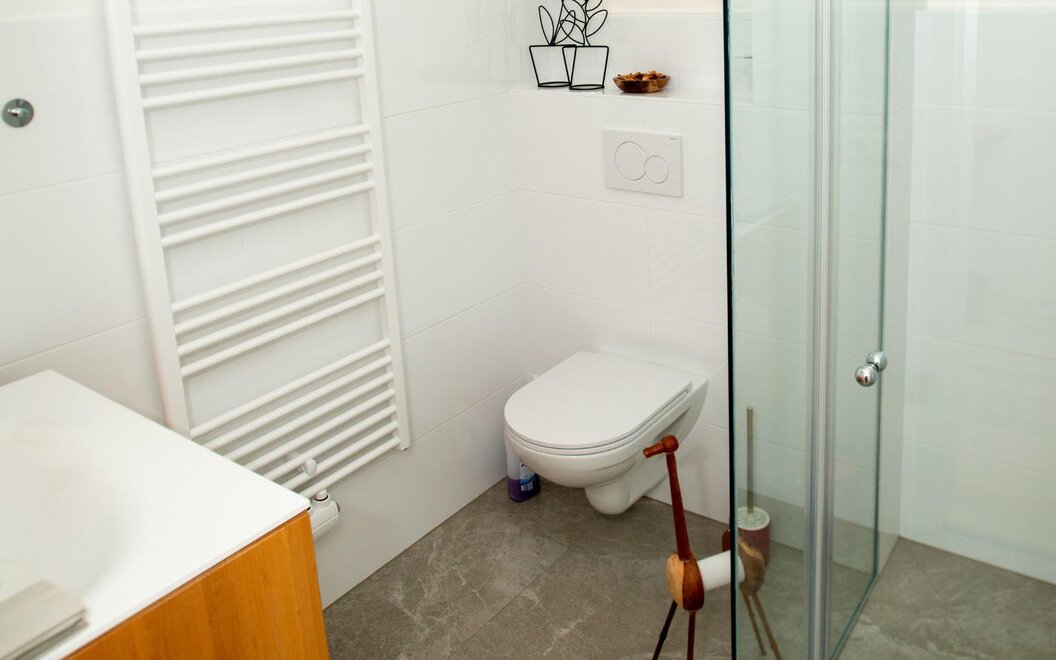 Bedroom with 1 double bed and 1 single bed, shower and WC, bed linen and towels.