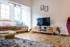 Apartment Seeblick in Grundlsee combines modern comfort with rustic charm on 50 square meters on the first floor. It accommodates up to four people, featuring a double bed in the bedroom and a sofa bed in the living area.