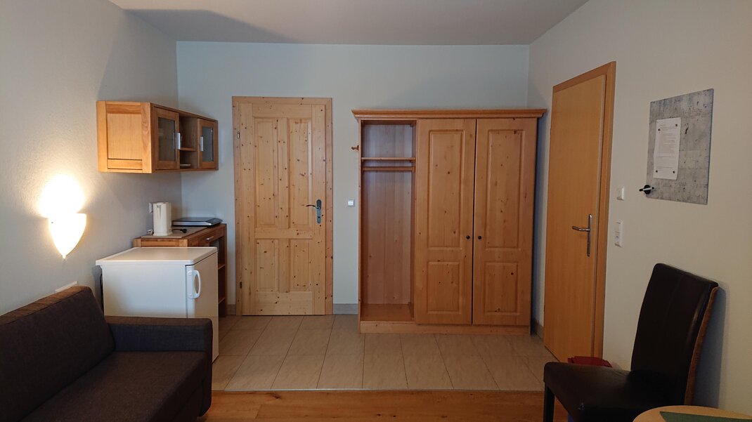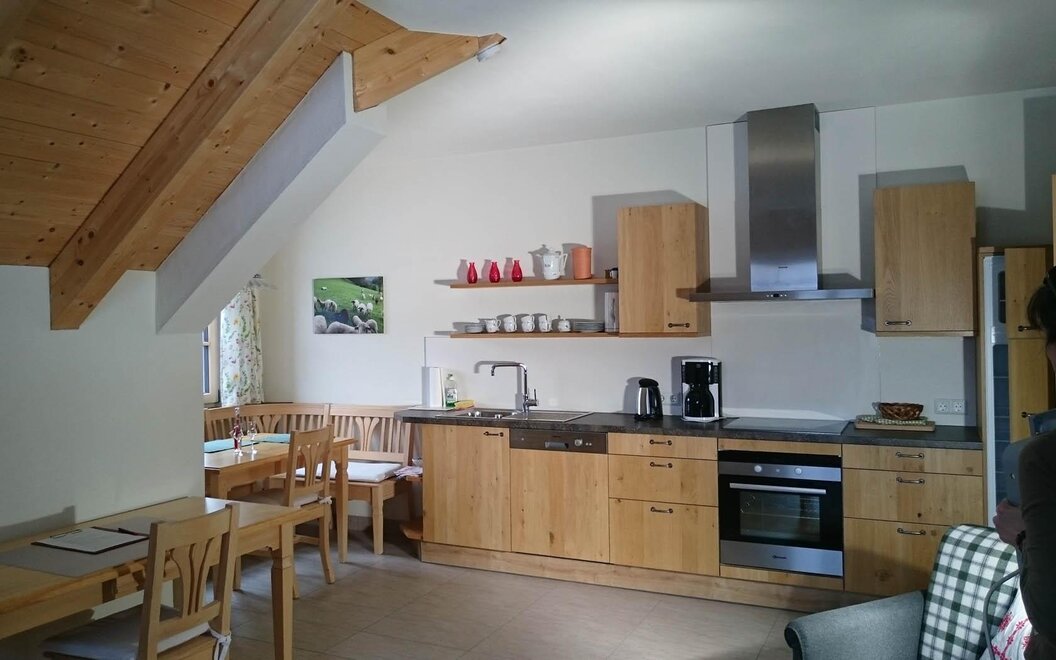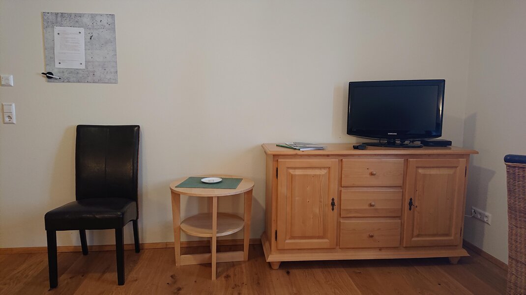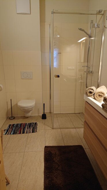 Upper floor, orientation south-east-west, 1 bedroom bedroom with pine double bed incl. bed linen, kitchen with spacious dining area, desk incl. Lan, W-Lan, living room with bed for 3rd person, comfortable couch and reading corner, Sat/TV, shower/WC (separate) incl. towels and bath towels as well as hairdryer and washing machine, anteroom, underfloor heating, parking, boot dryer, private sunny balcony.