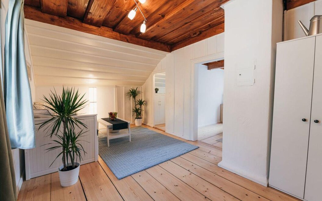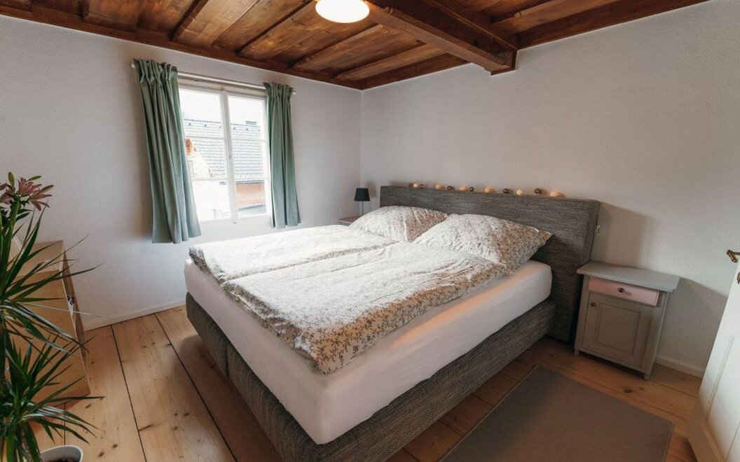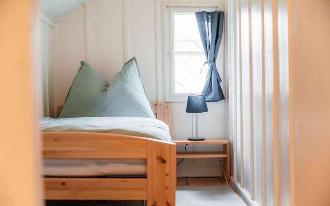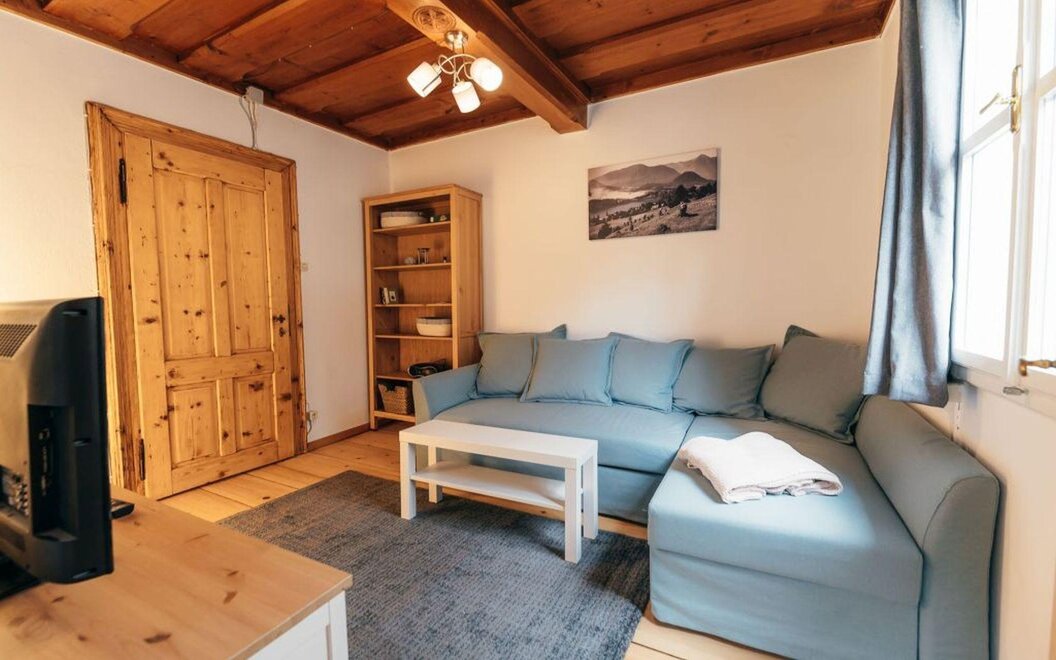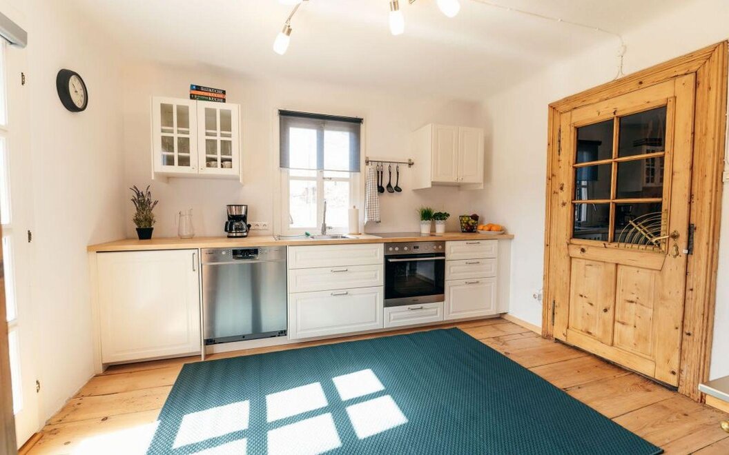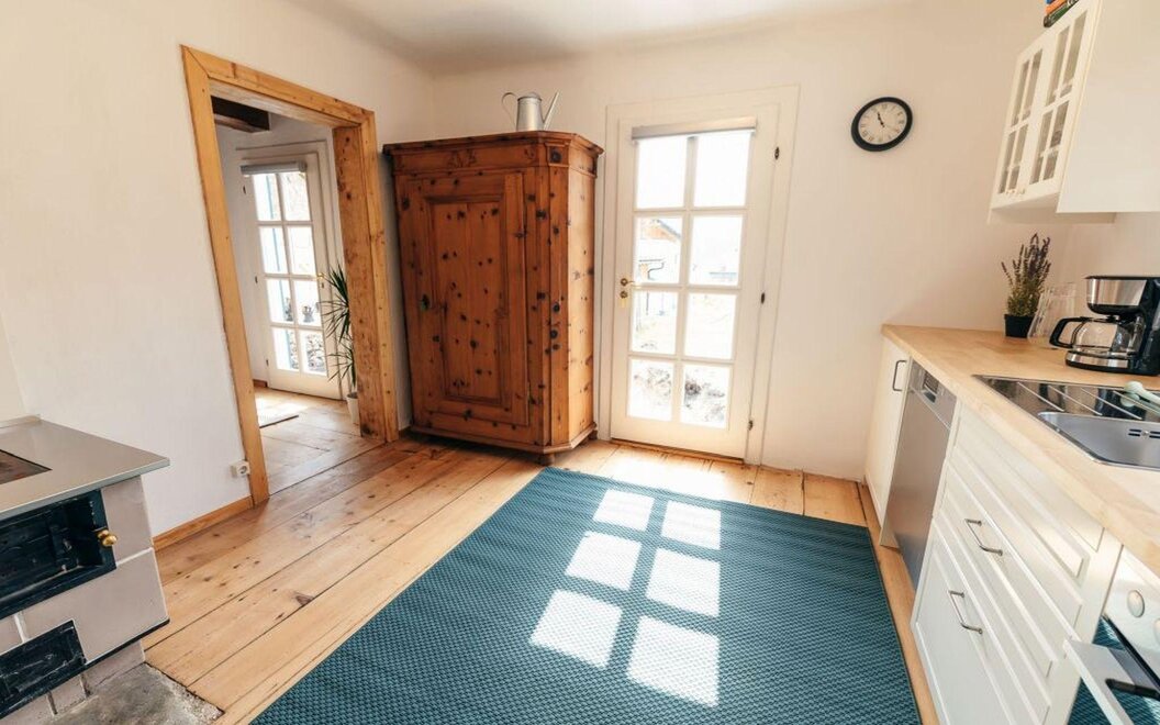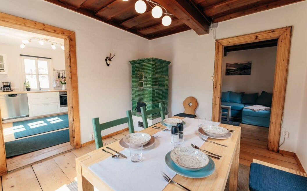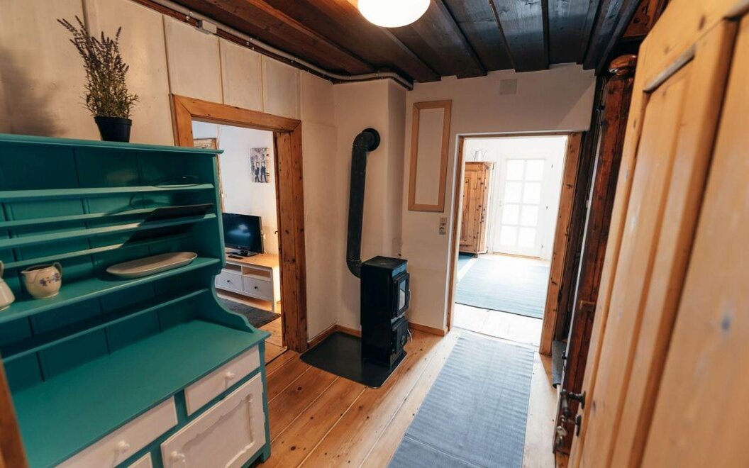 Spread over two floors, the house accommodates up to three adults and two children. The facilities include a newly renovated bathroom, a fully equipped kitchen with a wood stove, a dining room with a tiled stove, and a cozy living room with cable TV. On the upper floor, there is a bedroom with a box spring bed, a single room, and a connecting room with a day bed – ideal for families.